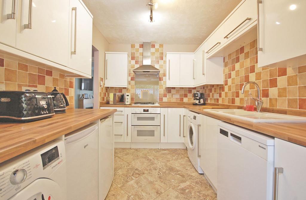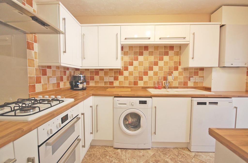 Matching wall and base units with edged work surfaces, one and a half bowl sink and drainer with central mixer taps, built-in double oven, gas hob, extractor hood, space for low level fridge, low level freezer, dishwasher, washing machine and tumble dryer, wall-mounted boiler, tiled flooring, textured ceiling.