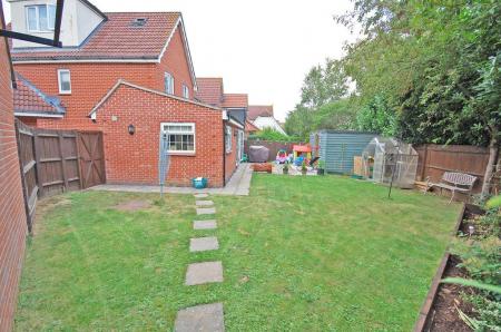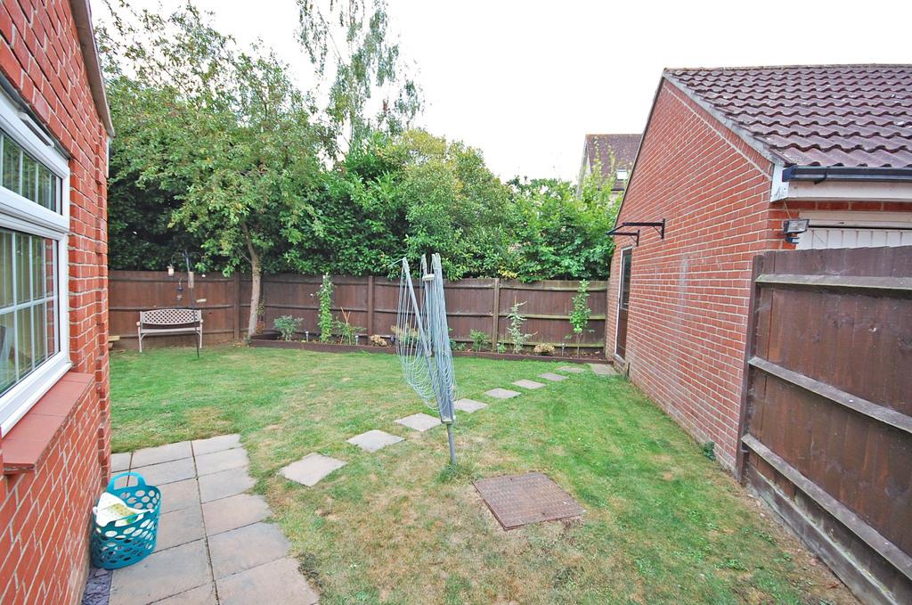 Unoverlooked enclosed rear garden, mainly laid to lawn, hardstanding patio area, shed, side access to garage, side access via a gate to parking area.