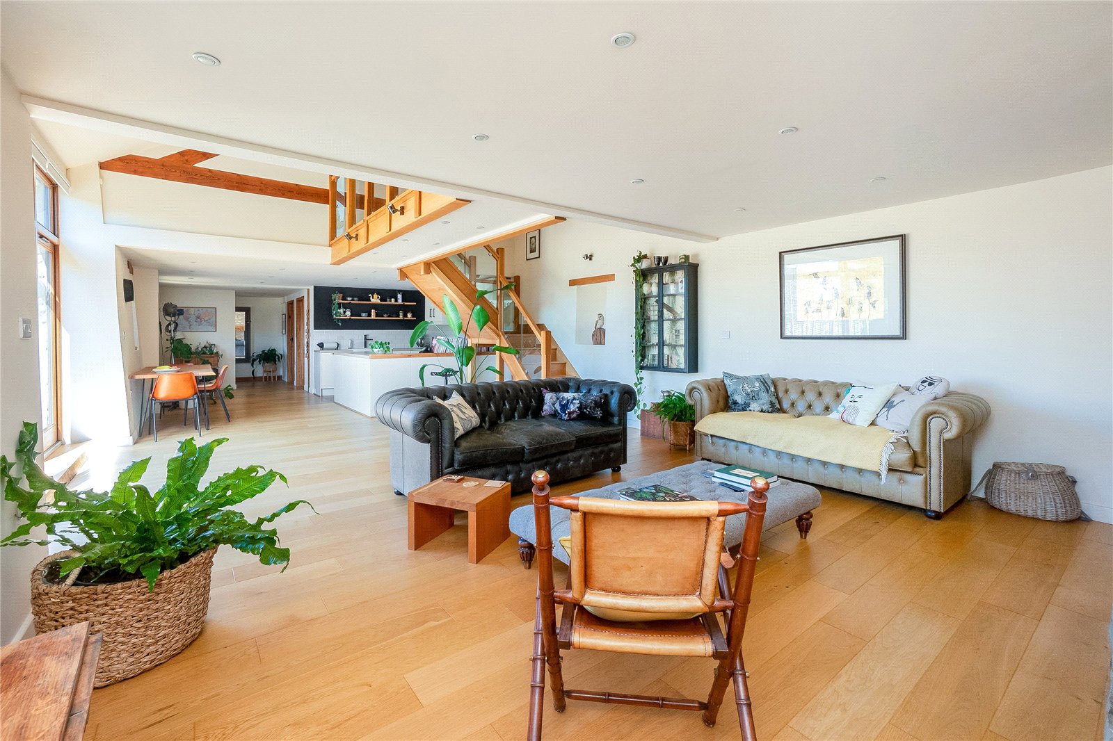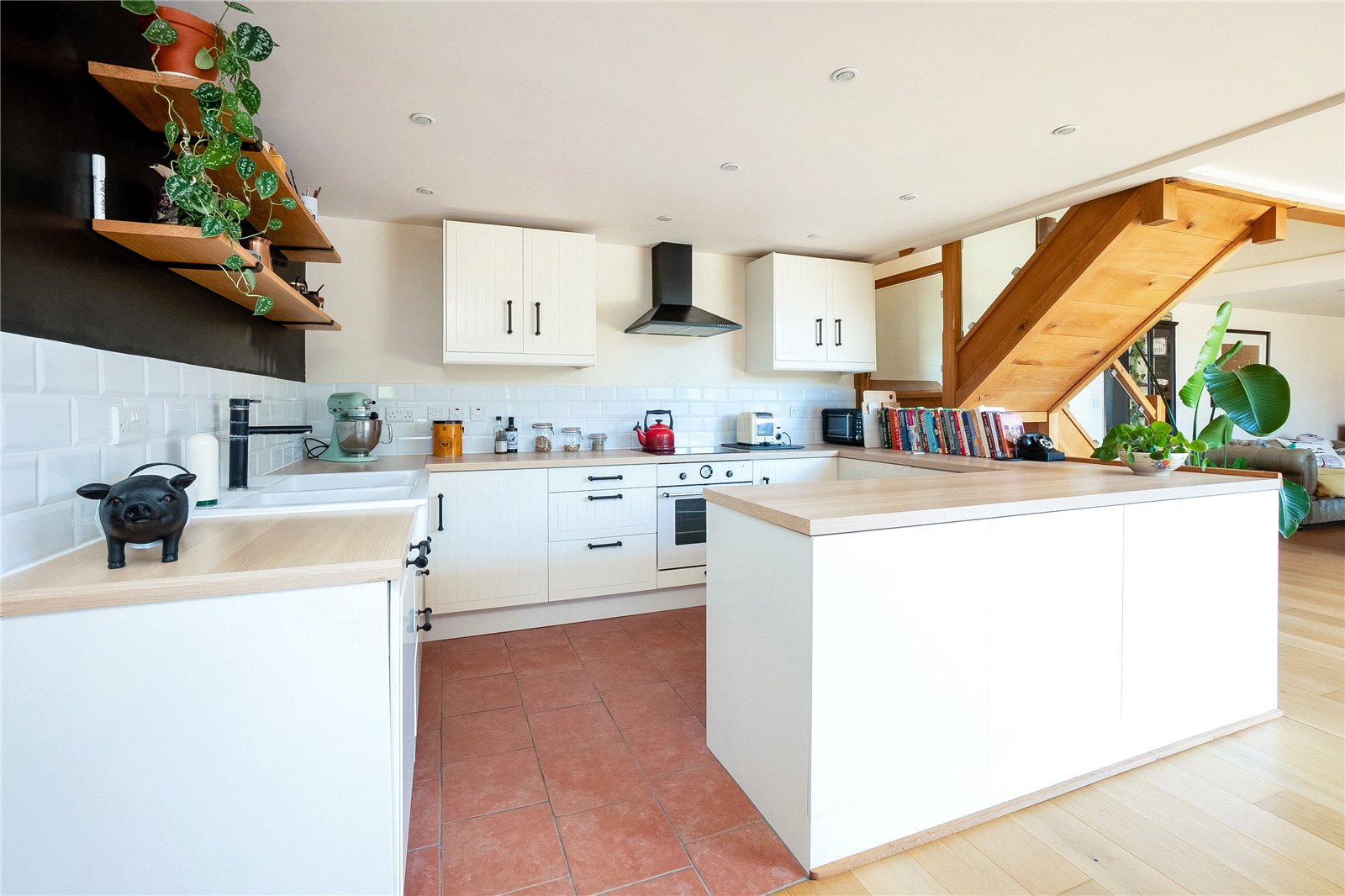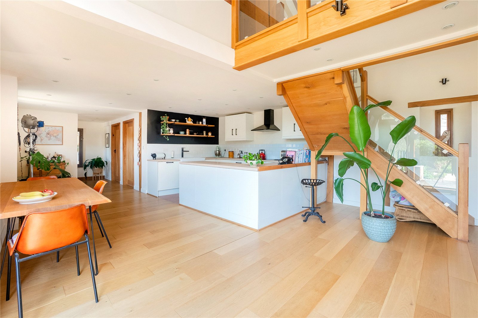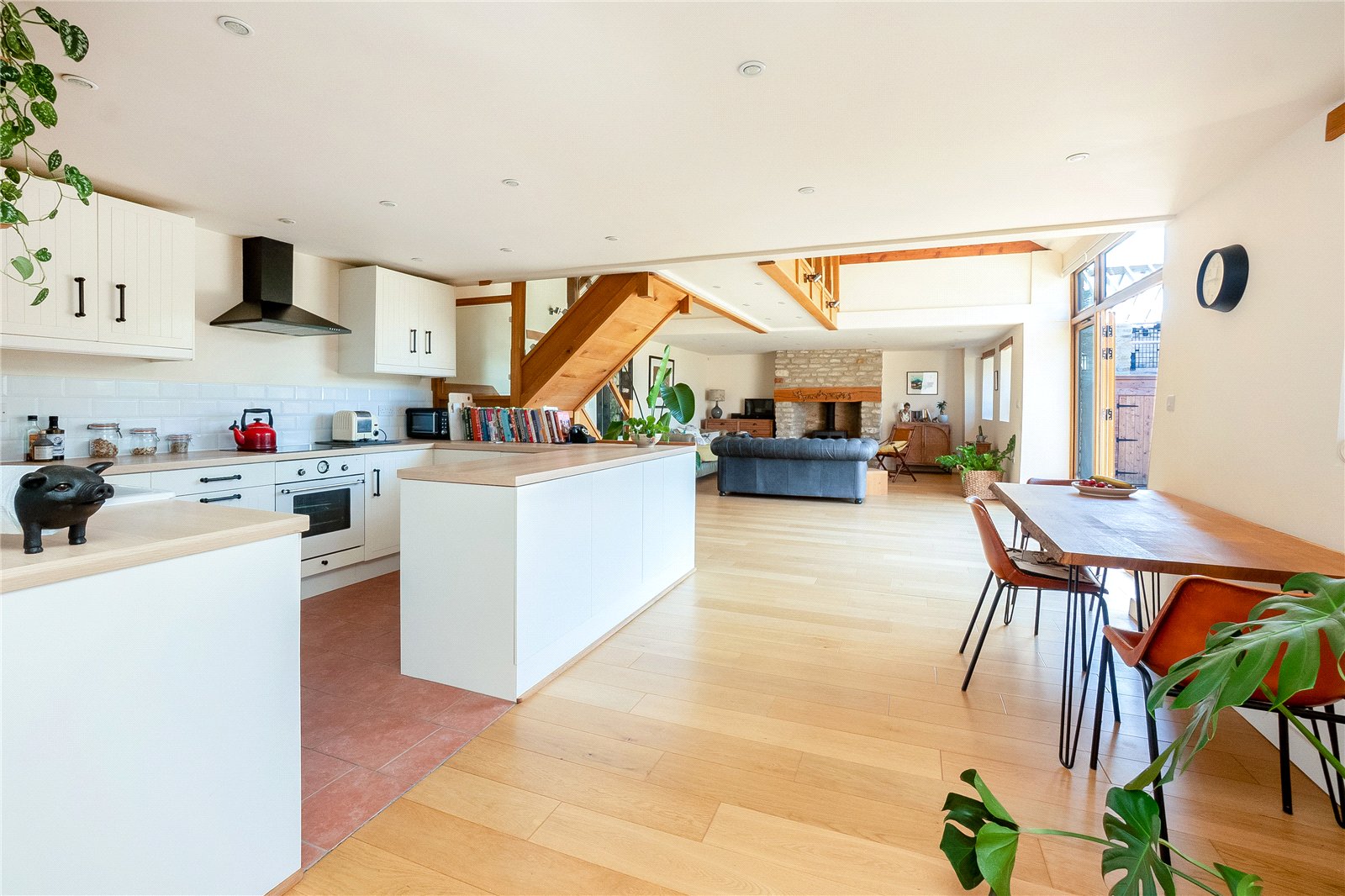 Open Plan Kitchen/Dining/Sitting Room: Engineered oak flooring with underfloor heating, 50ft social space with solid oak staircase glass gallery over, large floor to ceiling wooden windows that bring in lots of natural light and look out onto the private garden. Feature wood burner with exposed stone surround. Kitchen is fitted with base units, integral oven, and hob, dishwasher, double butler sink with mixer taps.