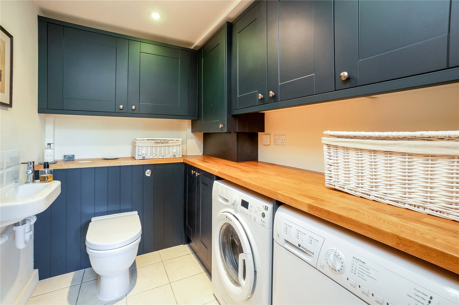 Cloakroom/Utility: Wooden worksurfaces, built-in shelving and cupboards, washing machine and tumble dryer, low level WC and wash basin.