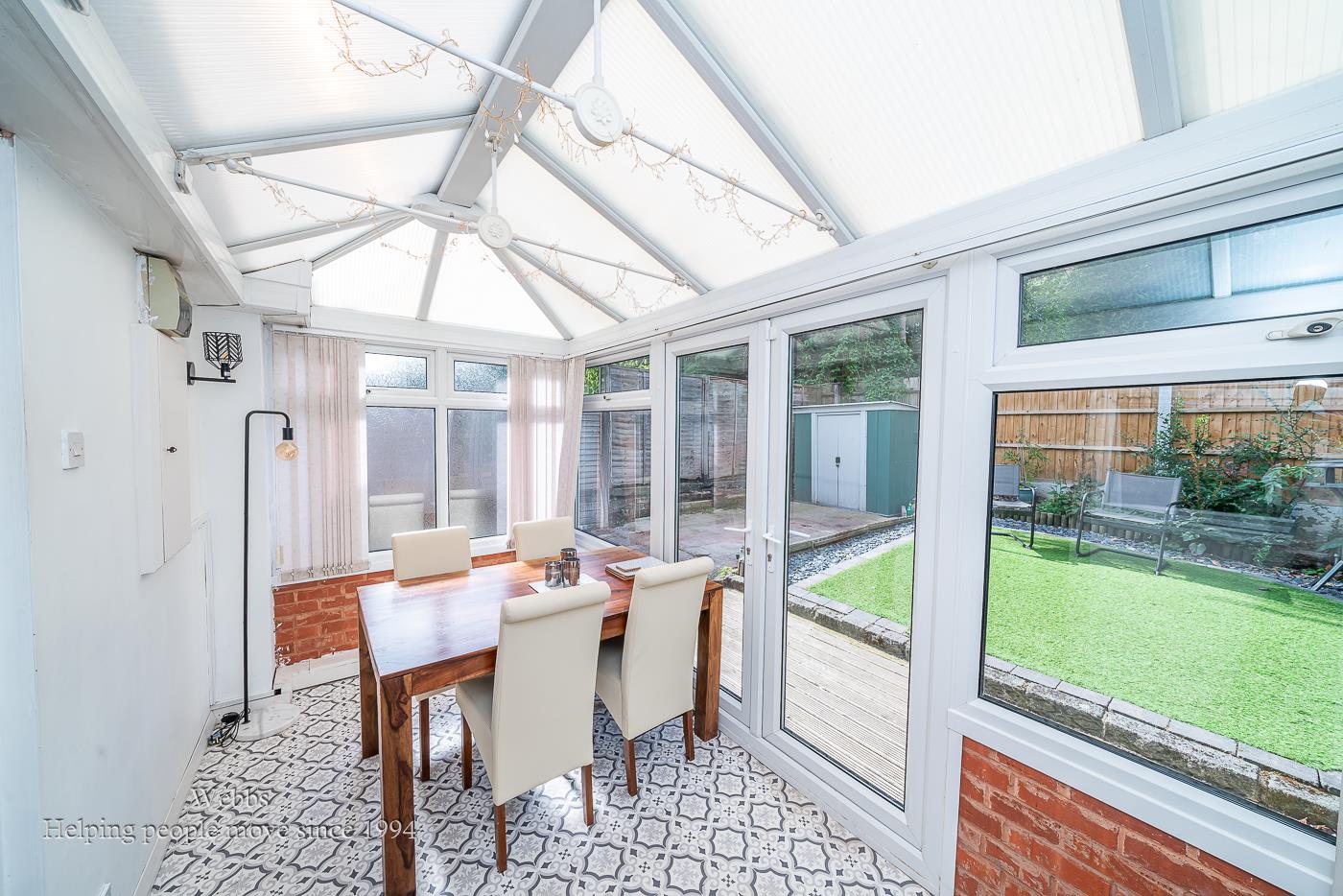 Outside, the property benefits from an enclosed rear garden with low-maintenance artificial lawn, along with a side gate giving access to the front driveway and neatly lawned garden.