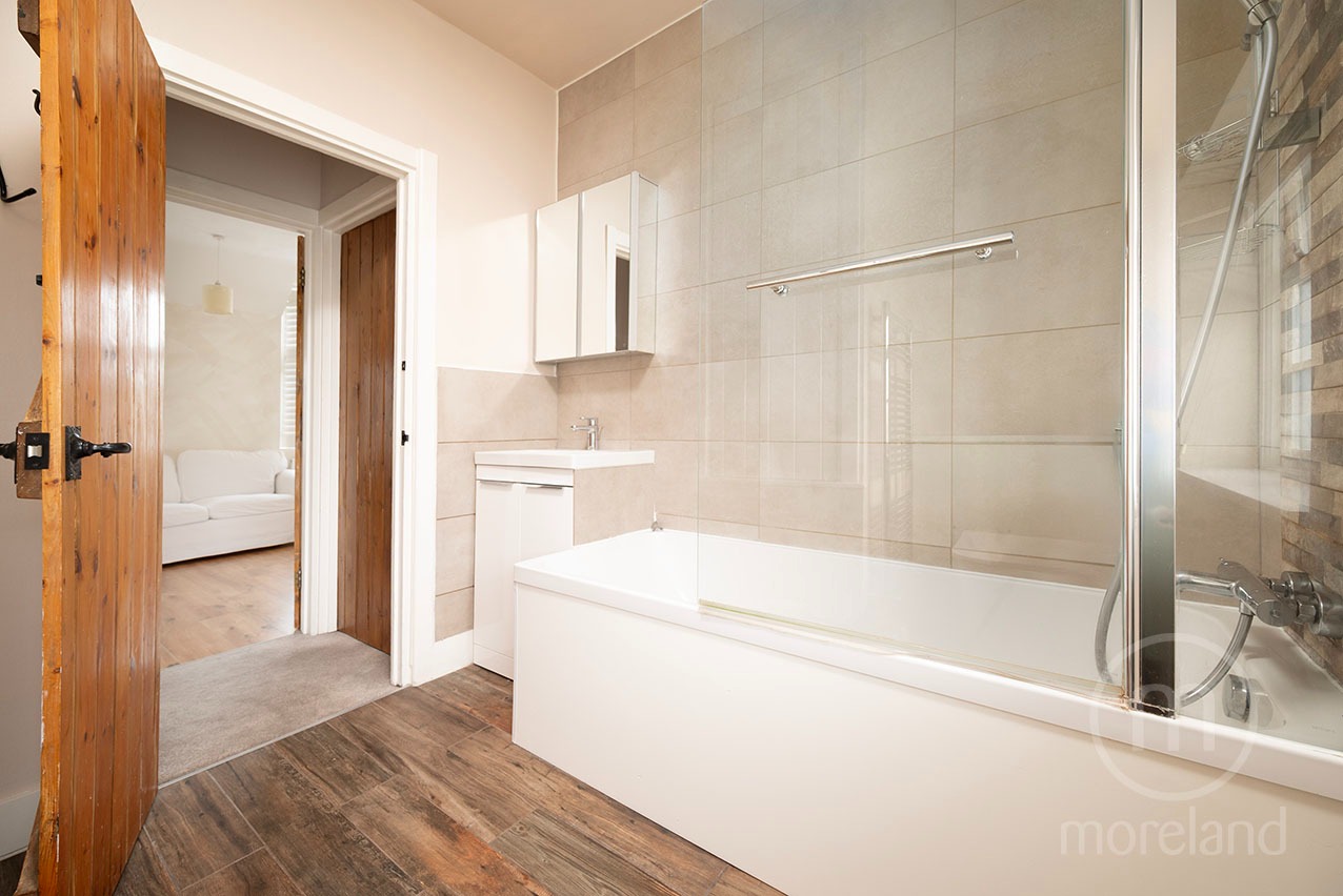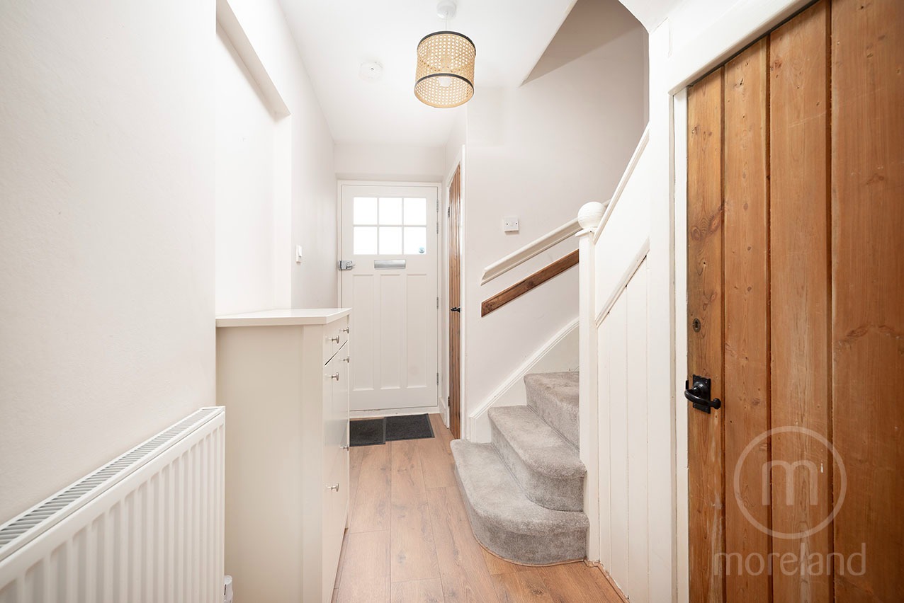 Upstairs are two double bedrooms with fitted storage and a modern bathroom. Further benefits include replaced windows, radiators and flooring, a fully boarded and carpeted loft with potential to convert (STTP), modern wiring, and landscaped front and rear gardens.