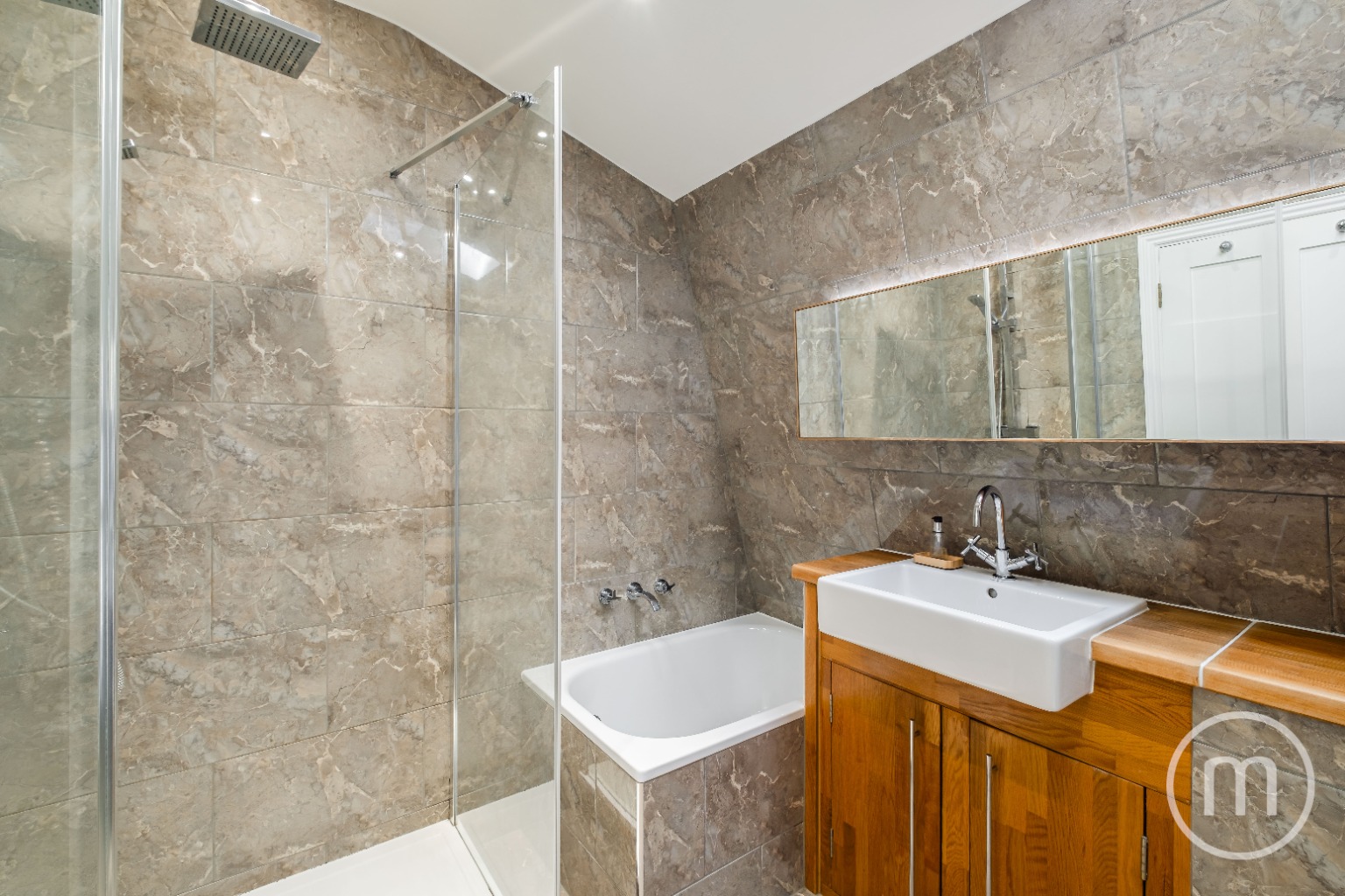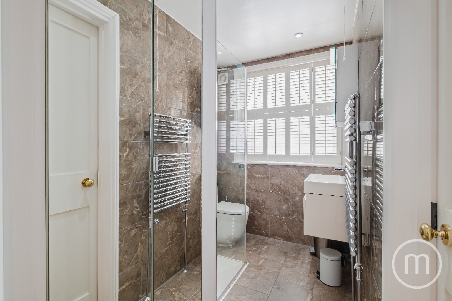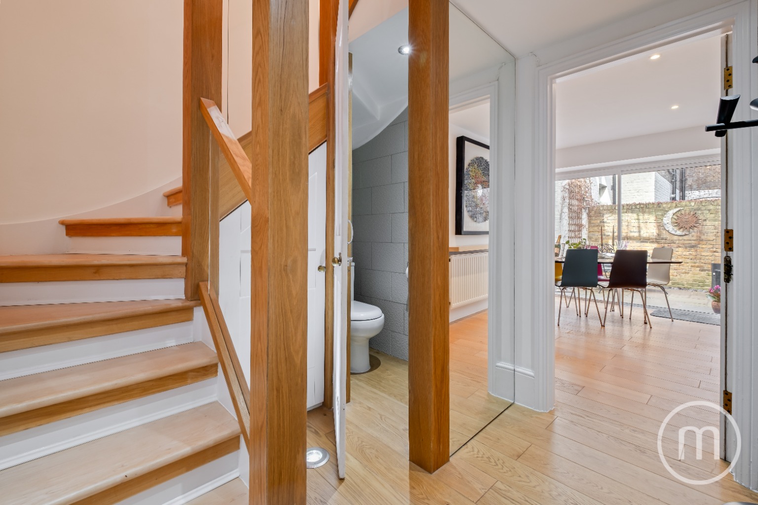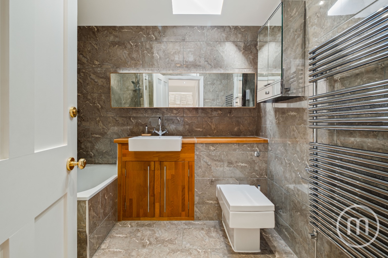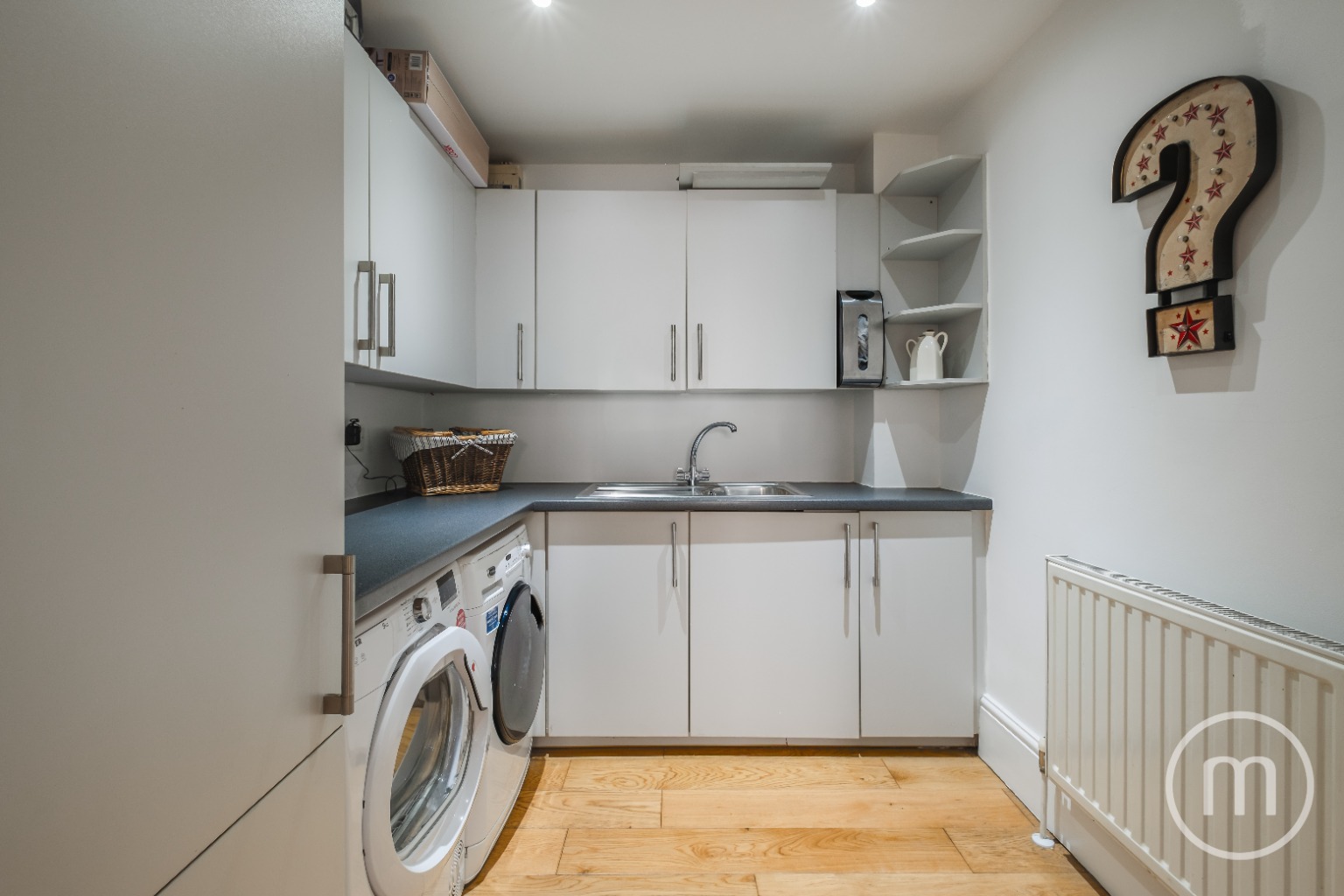 On the lower ground floor, there is a well-appointed kitchen/dining room with integrated appliances, alongside a separate utility room and a guest cloakroom. Sliding doors lead directly out to a private south-easterly facing garden, offering an ideal setting for outdoor dining and relaxation.