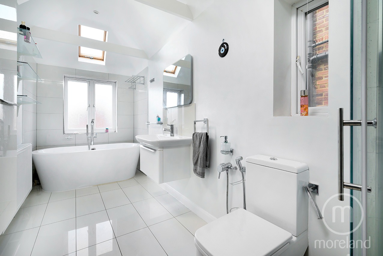 Beautifully presented throughout, the house combines period character—bay windows, fireplaces and wood floors—with modern finishes. The ground floor features a 27'8" through-reception and a bright kitchen/dining room (17'7" x 16'3") with skylights and doors to the garden, plus a guest WC.