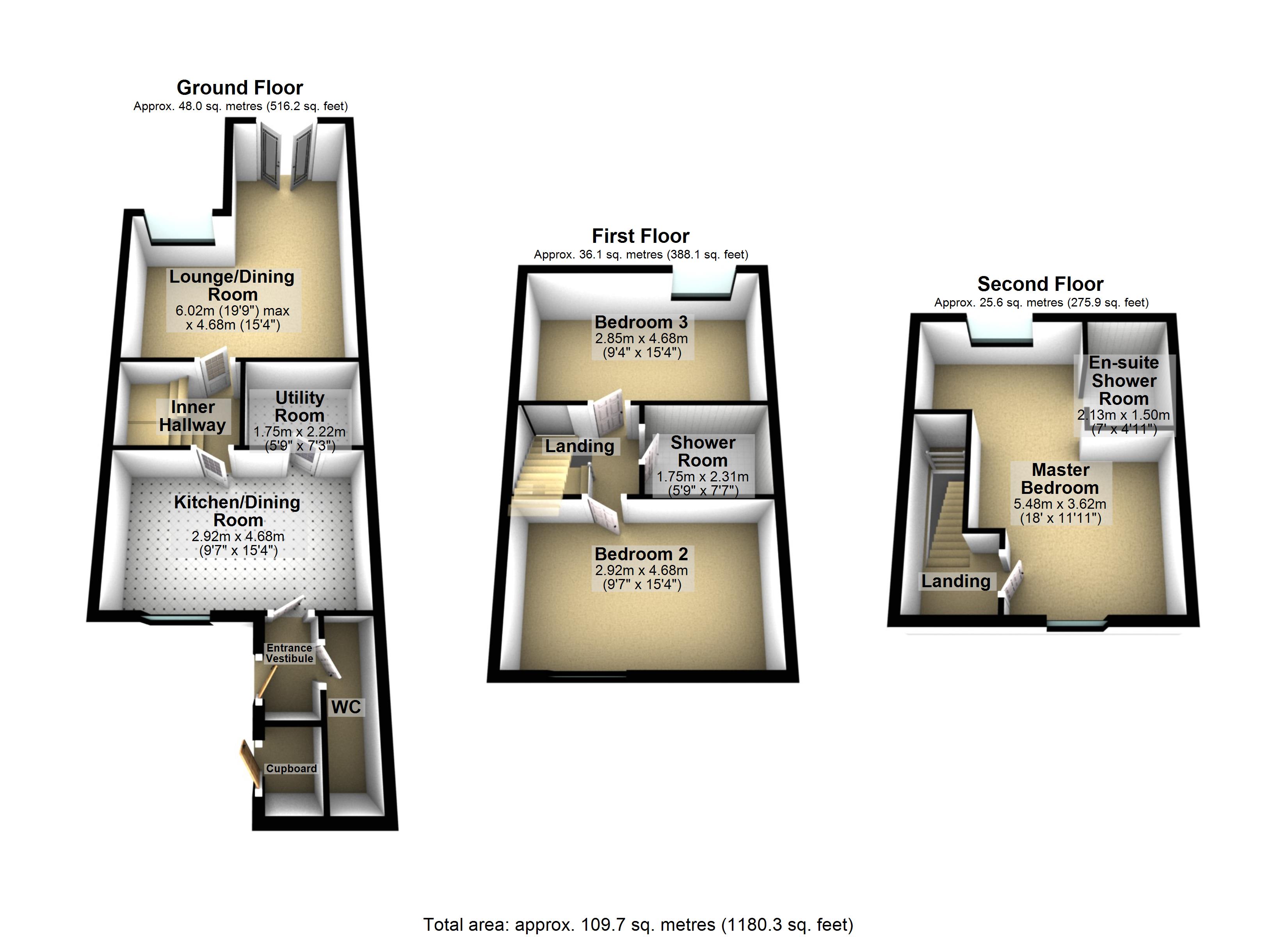 Internally the accommodation covers approximately 1180sqft of living space over THREE LEVELS and boasts QUALITY FIXTURES AND FITTINGS installed throughout, comprising of entrance hallway, OPEN PLAN LIVING/DINER with patio doors leading to garden, modern fitted kitchen/diner, utility, downstairs w.c, THREE DOUBLE BEDROOMS, en suite and a DELUXE FAMILY SHOWER ROOM.
