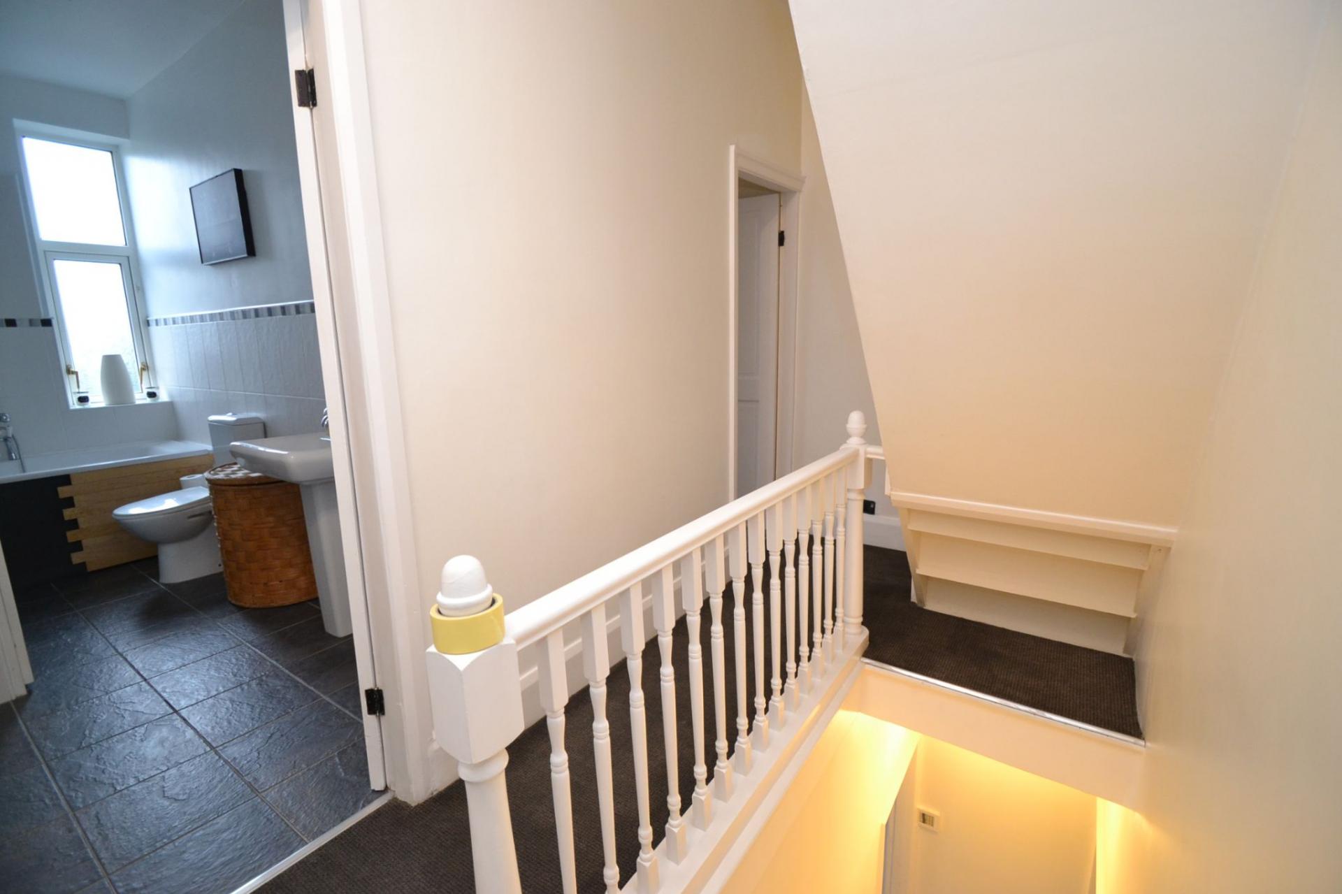 First Floor: Stairs to the first floor landing.