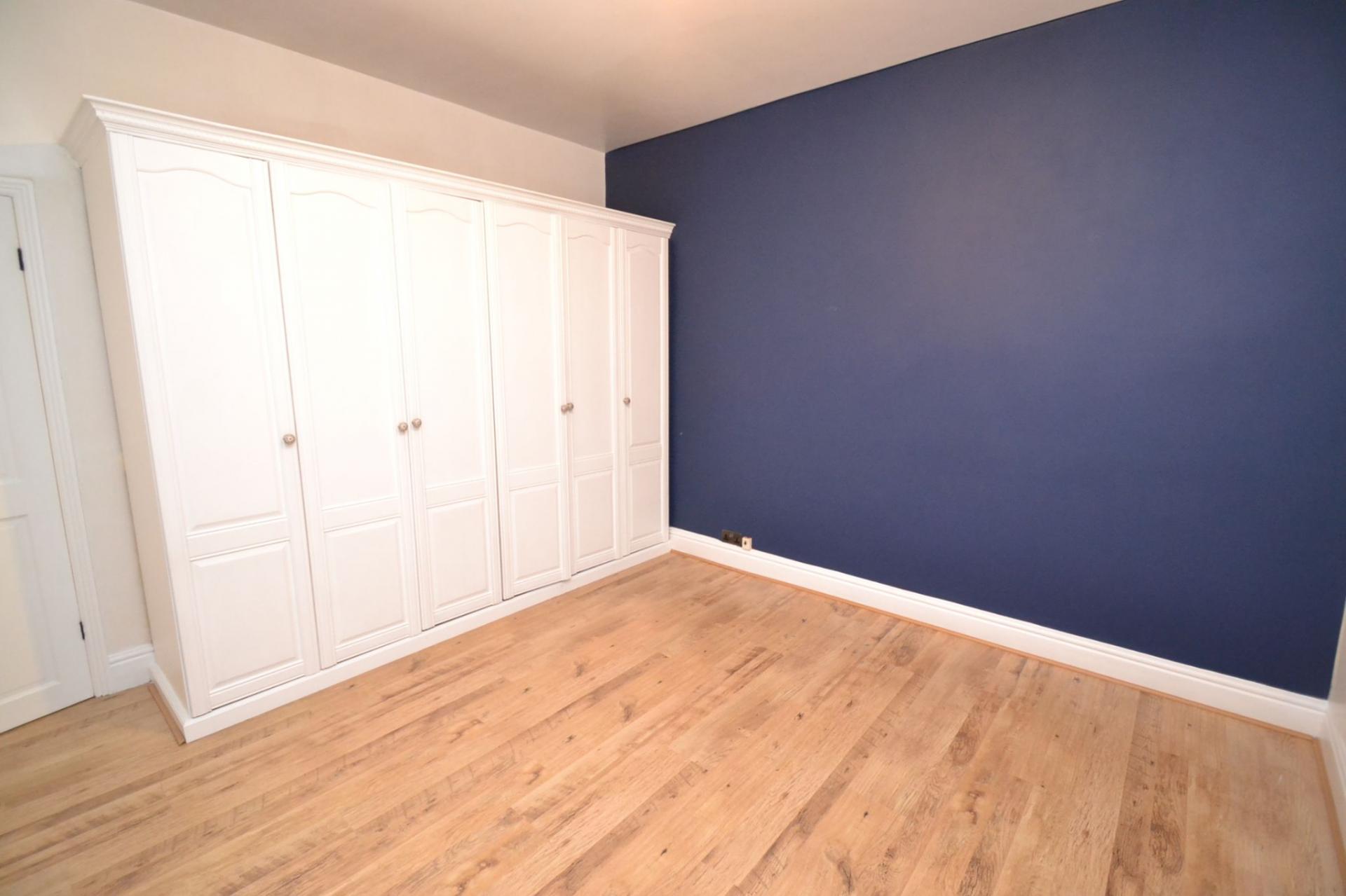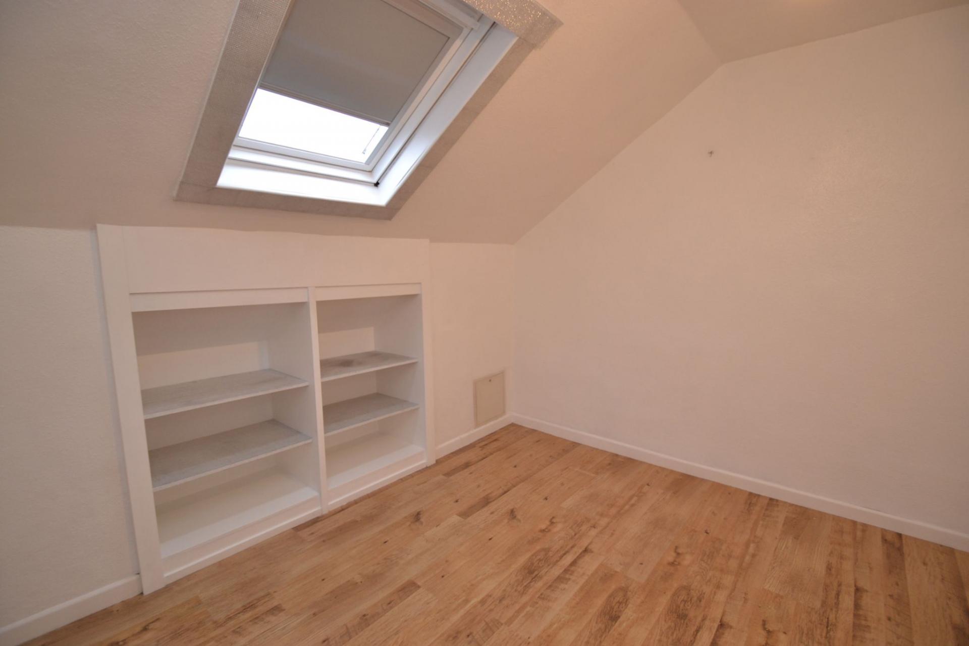 Front Attic Bedroom 4/Homework Office. 3.33m x 3.14m (10'9 x 10'3). Dg skylight window, laminate floor, plenty of cupboard storage, shelving.