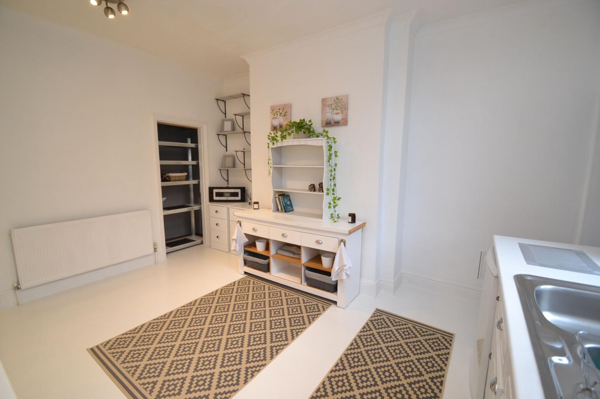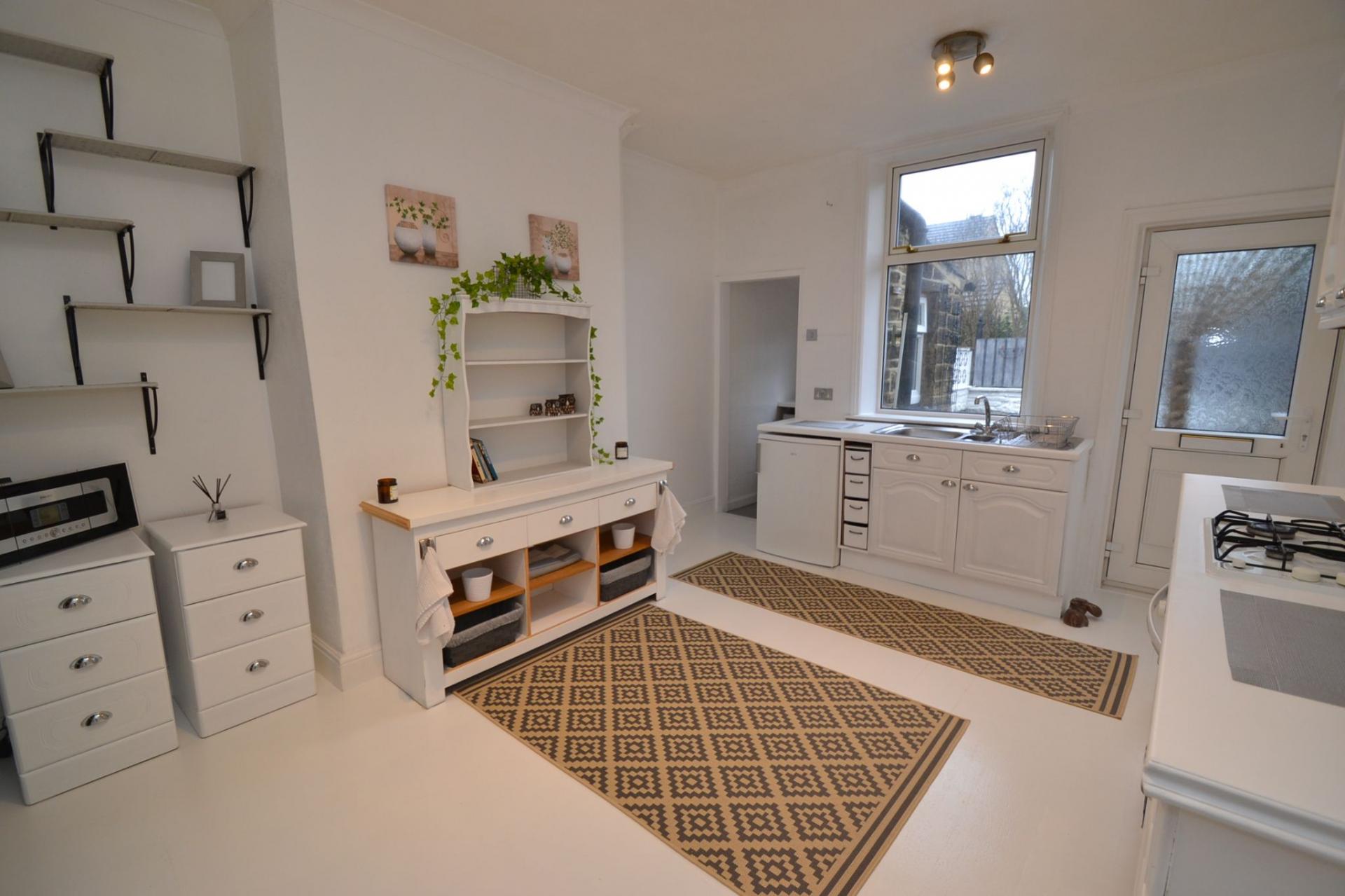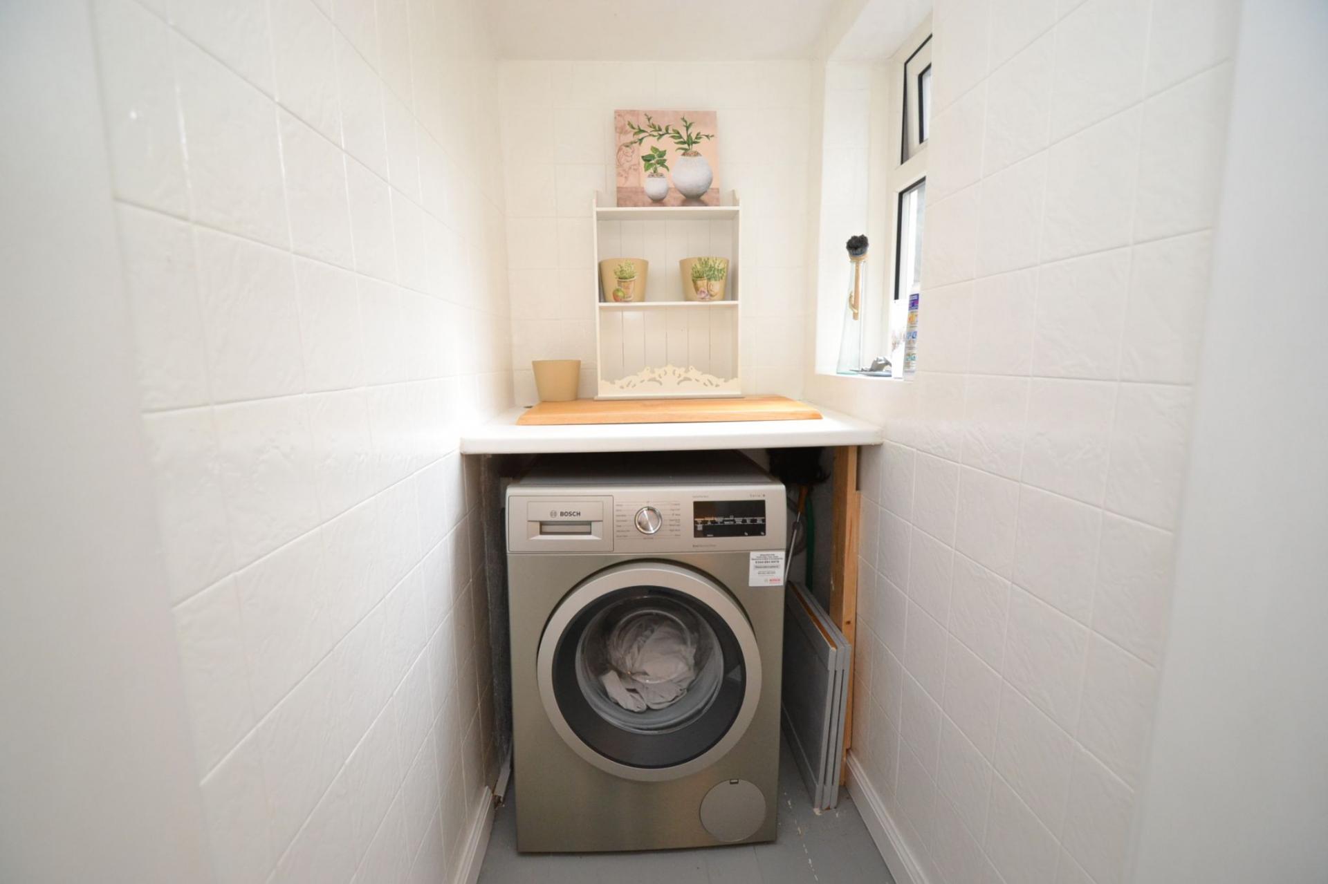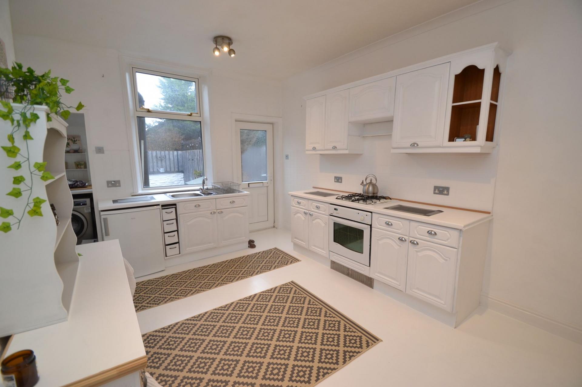 Dining Kitchen: 4.36m x 3.72m (14'3 x 12'2). Range of wall & base units in white, work tops with tiling above, stainless steel 1.5 sink with mixer tap, space for a fridge, 4 ring gas hob, built in gas oven, useful under stairs storage, Upvc dg window and Upvc entrance door to rear, radiator, tiled utility area plumbed for an auto-washer, Upvc dg window.