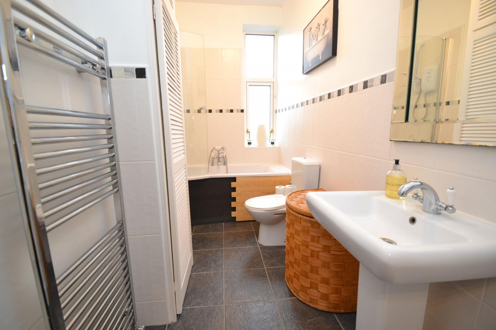 Bathroom: 3.64m x 1.45m (11'9 x 4'7). Three piece suite in white, part tiled, chrome telephone mixer tap, shower screen with an electric shower over the bath, tiled floor, heated chrome towel rail, storage cupboard, frosted Upvc dg window.