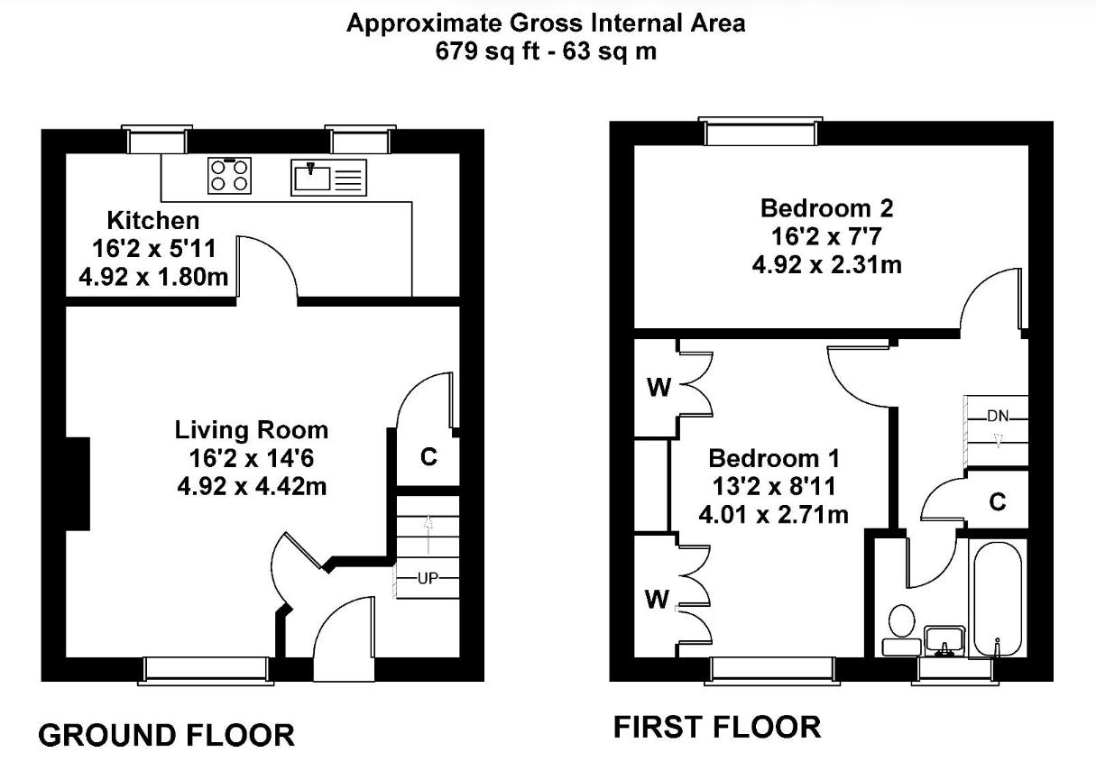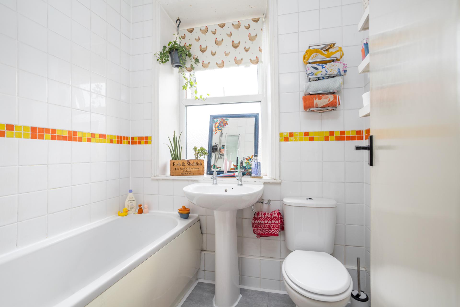 The spacious principal bedroom is positioned at the front of the property and benefits from excellent natural light, along with built-in wardrobes to both alcoves. The second bedroom is another well-proportioned double, overlooking the rear. The accommodation is served by a three-piece bathroom comprising a bath with shower over, WC, and pedestal wash hand basin.