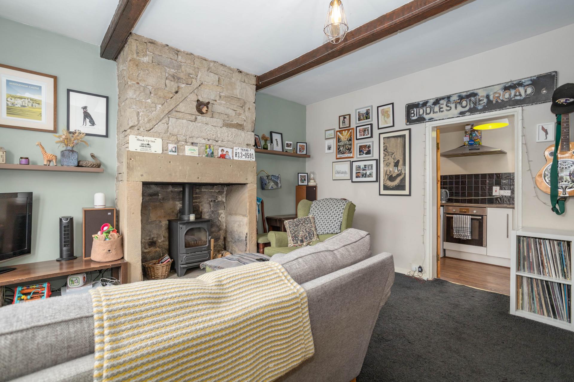 Inside, the property features a living room with space for both relaxing and dining, centred around a traditional stone fireplace with a multi-fuel stove. A contemporary kitchen with integrated appliances provides a practical and stylish space for everyday living.