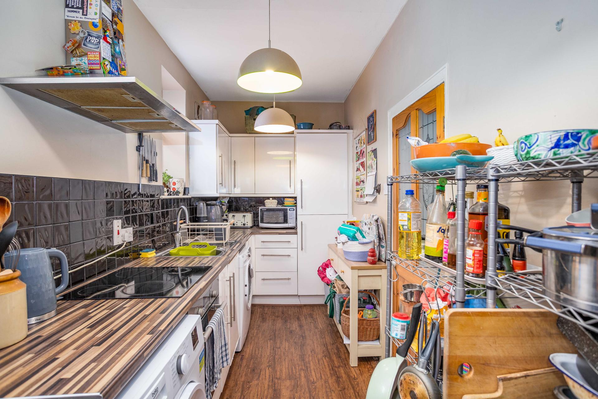 The property is accessed via a practical entrance vestibule, leading into a generous living room with ample space for both seating and dining. A traditional stone fireplace with a multi-fuel stove creates a charming focal point, while a useful understairs cupboard provides additional storage. The kitchen is fitted with a range of modern high-gloss units and includes an integrated fridge and freezer, an electric oven with induction hob, plumbing for a washing machine, and space for either a dryer or dishwasher.
