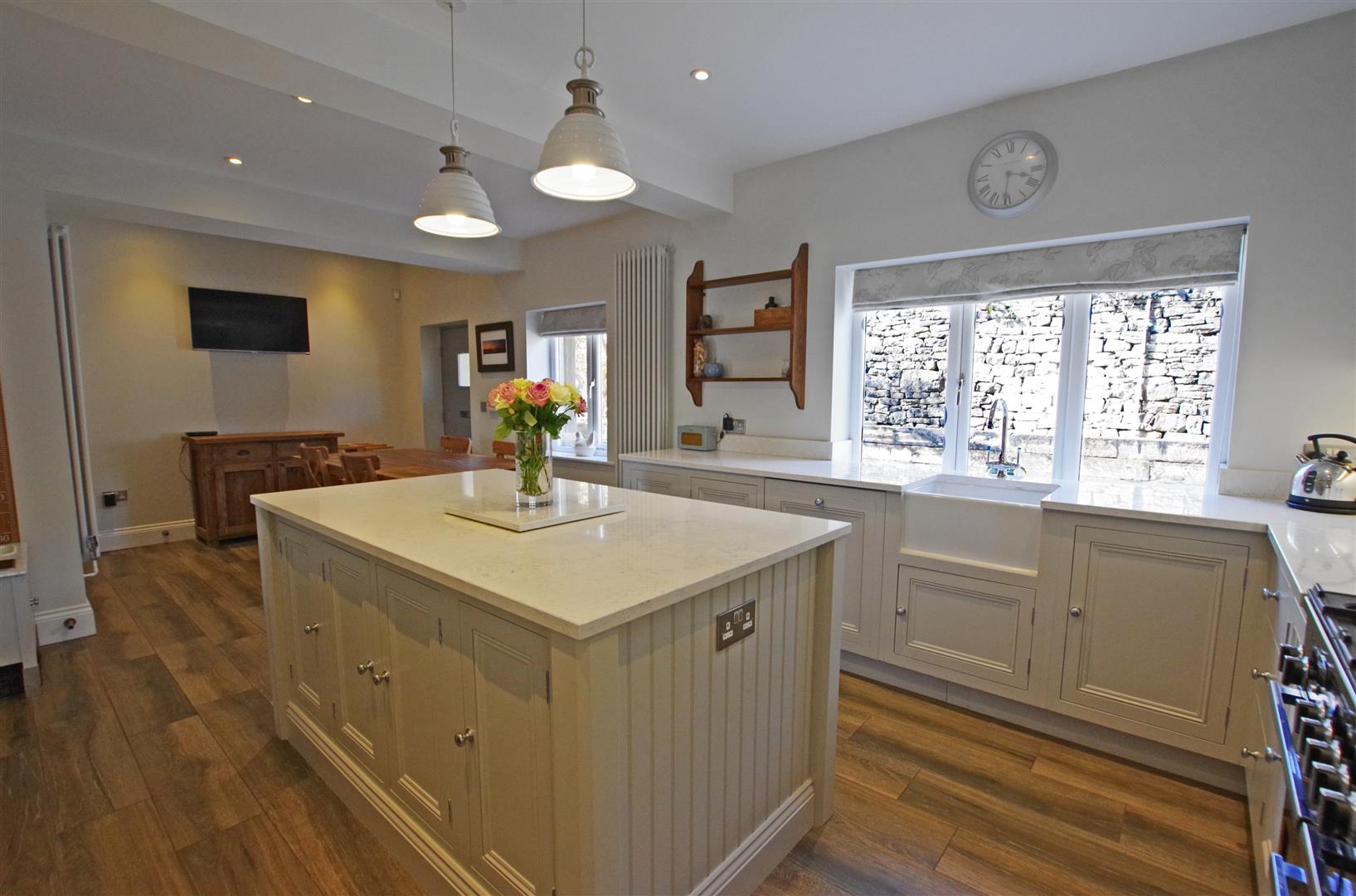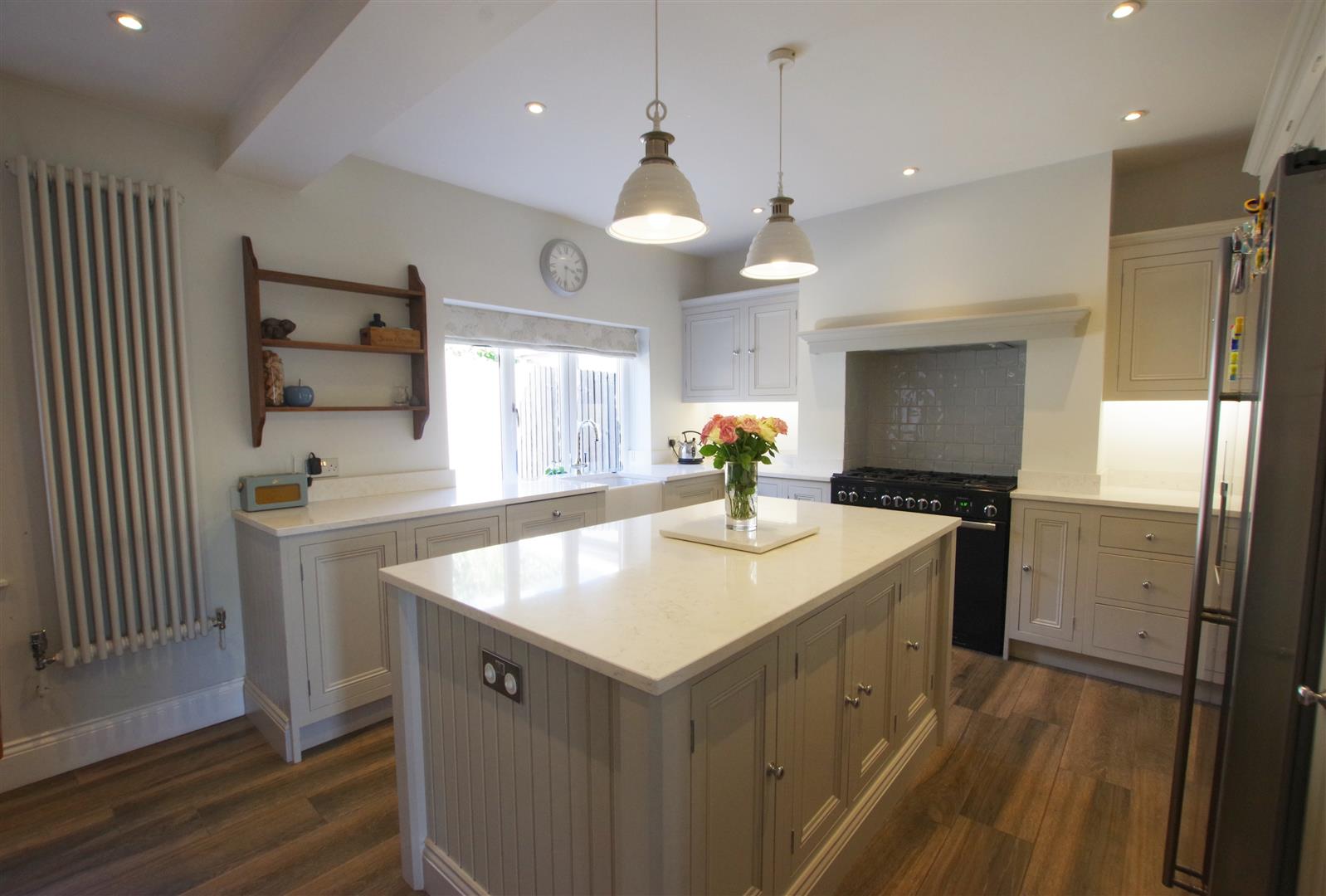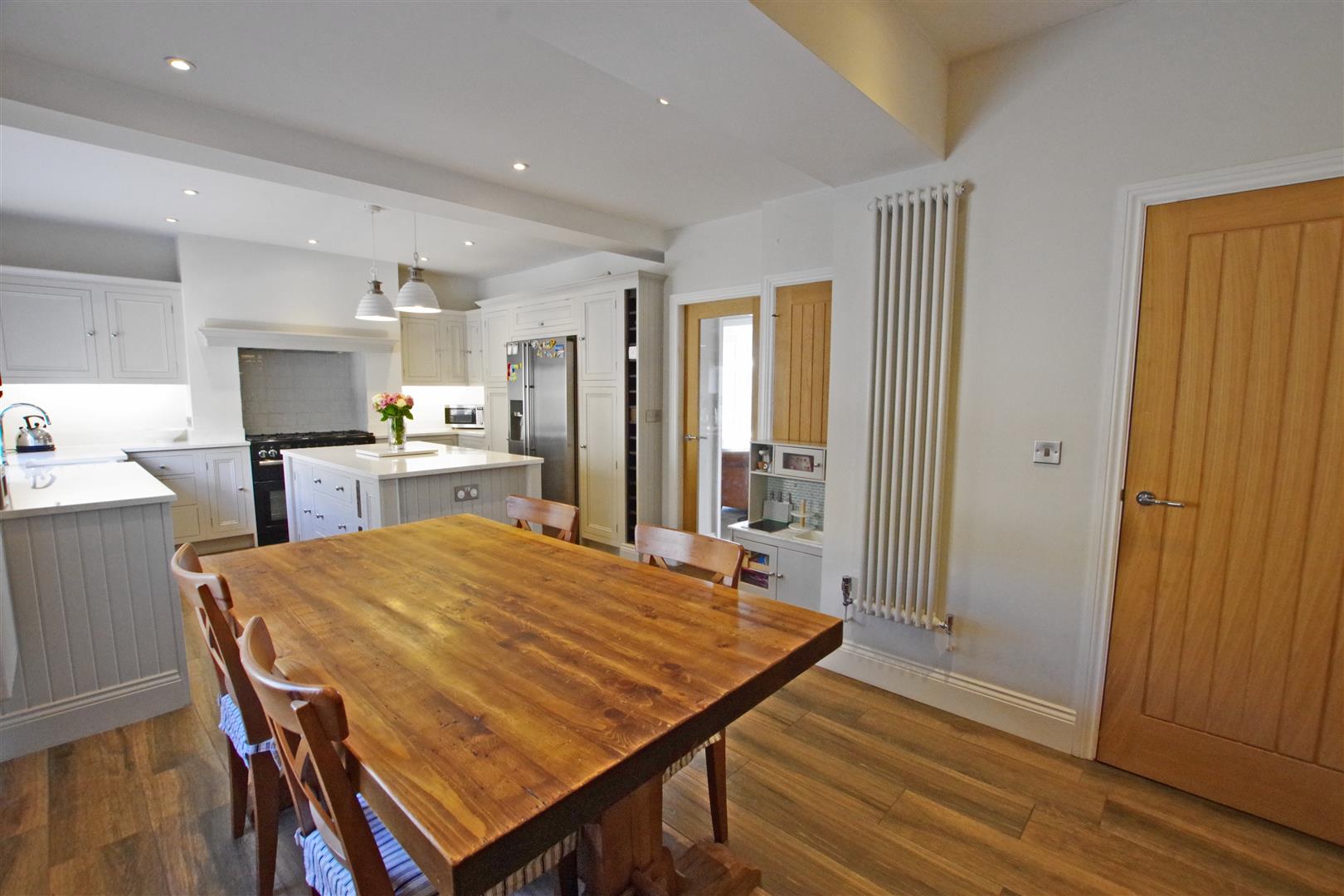 Dining Kitchen - 3.537 x 7.401 (11'7" x 24'3") - High specification fitted kitchen with a range of wall and base units and a central island. Quartz worksurfaces and upstands. Ceramic butler sink. Integrated dishwasher. Rangemaster dual fuel range cooker (available by separate negotiation). Two designer radiators. Access to cellar. Two UPVC double glazed windows to front elevation. Wooden double glazed front door.