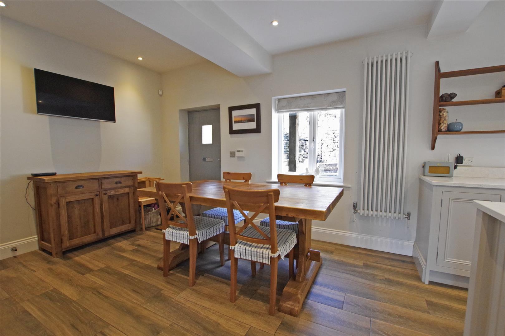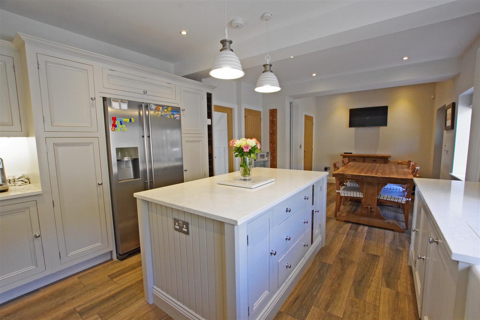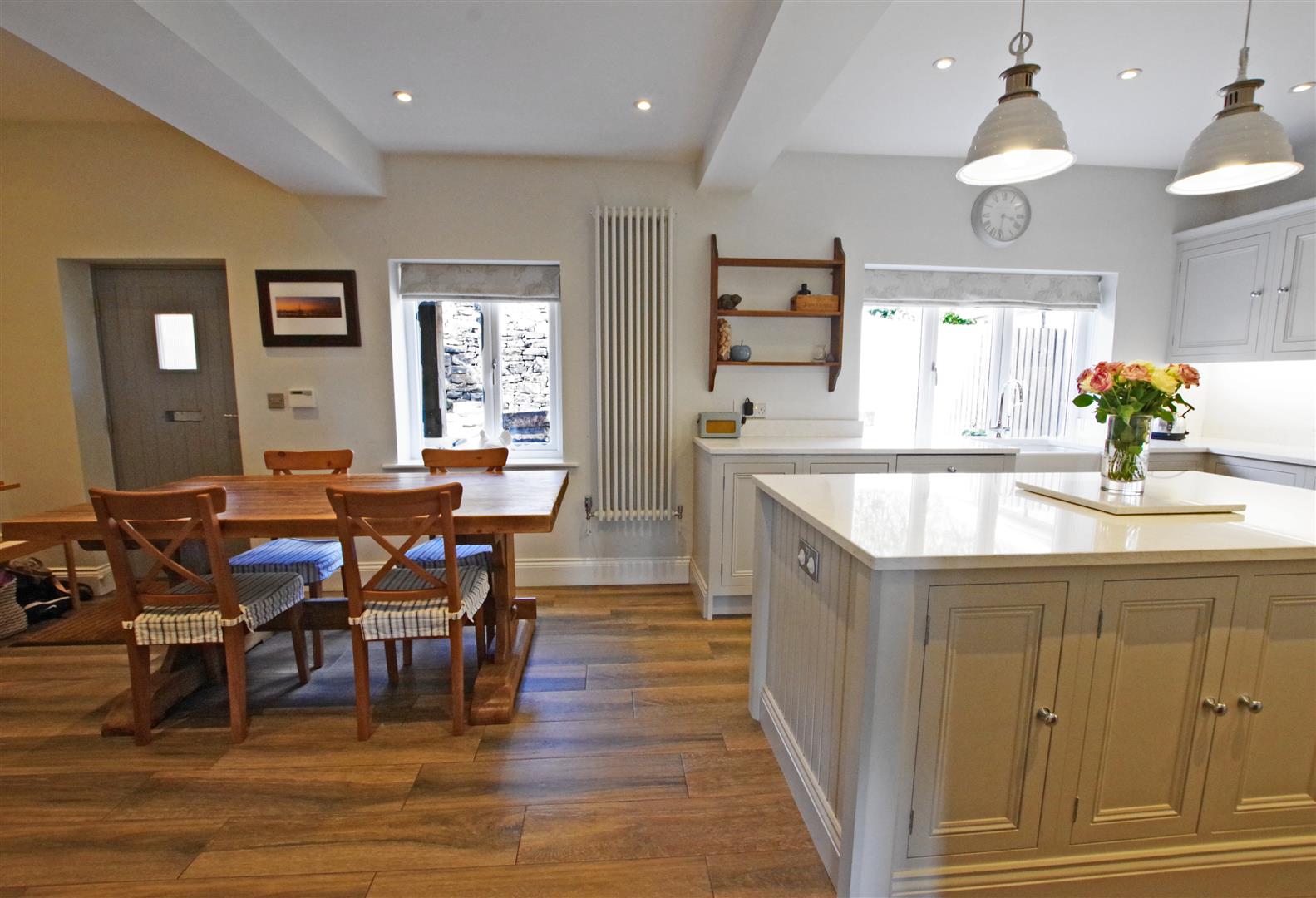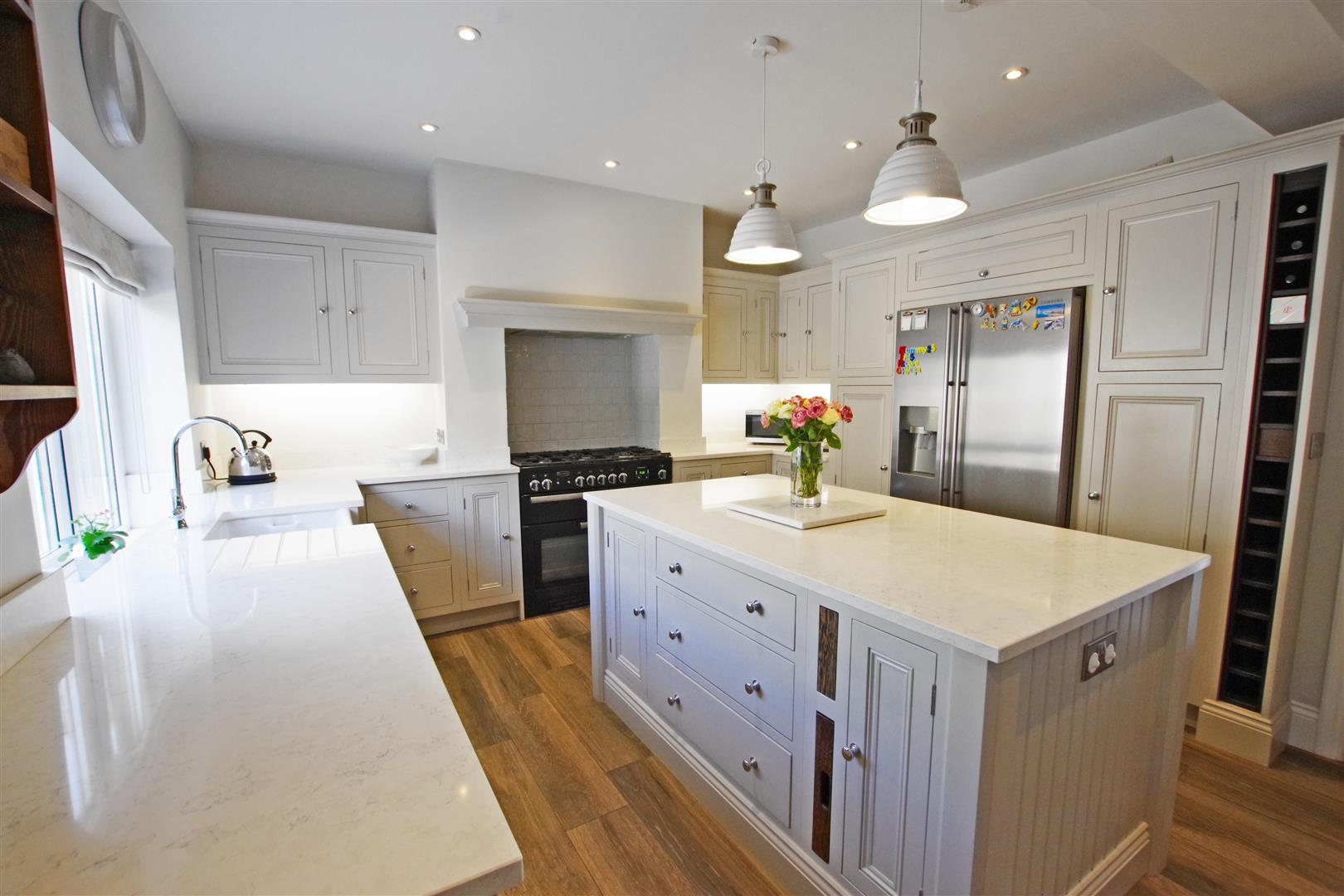 Dining Kitchen - 3.537 x 7.401 (11'7" x 24'3") - High specification fitted kitchen with a range of wall and base units and a central island. Quartz worksurfaces and upstands. Ceramic butler sink. Integrated dishwasher. Rangemaster dual fuel range cooker (available by separate negotiation). Two designer radiators. Access to cellar. Two UPVC double glazed windows to front elevation. Wooden double glazed front door.