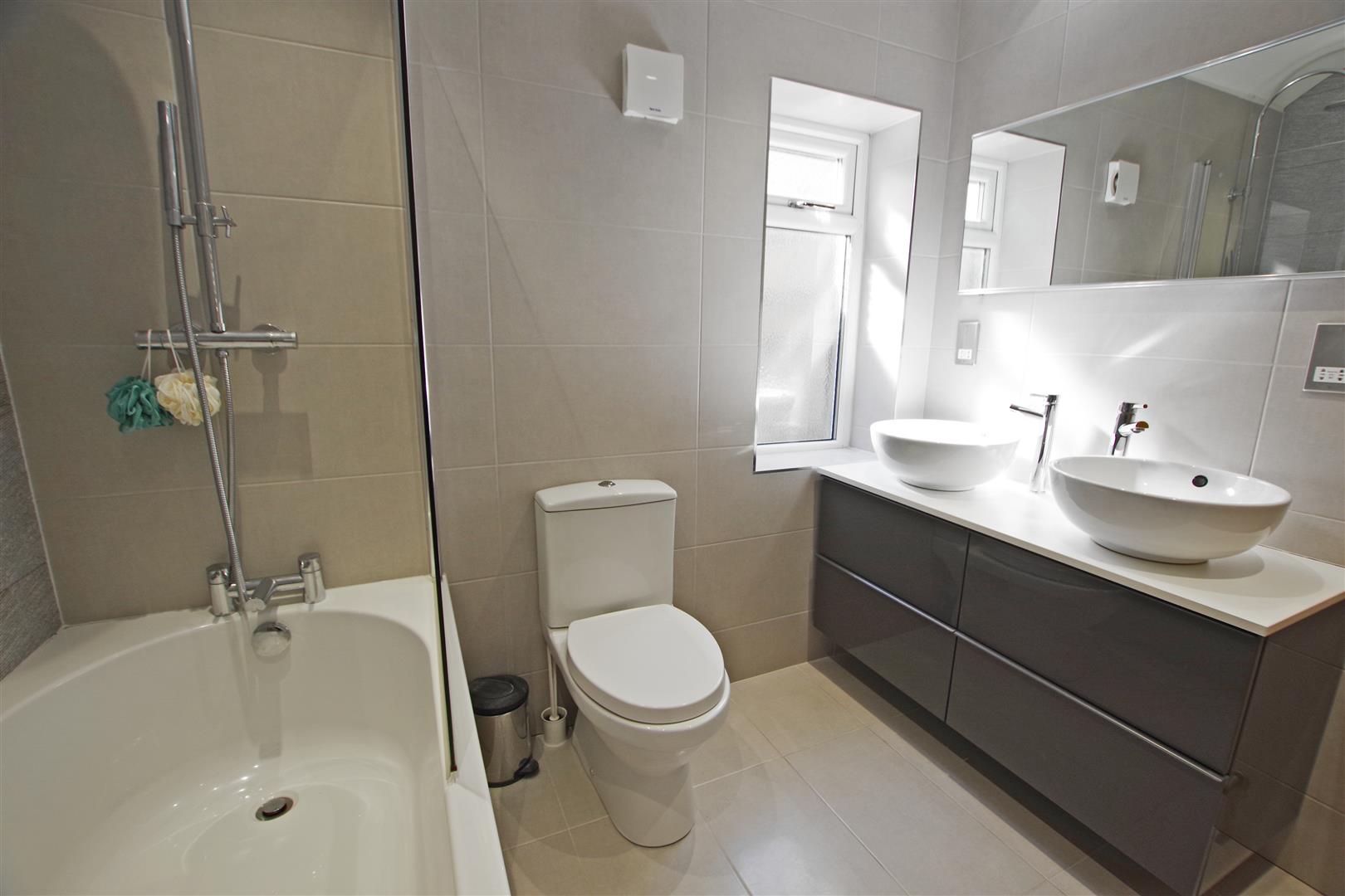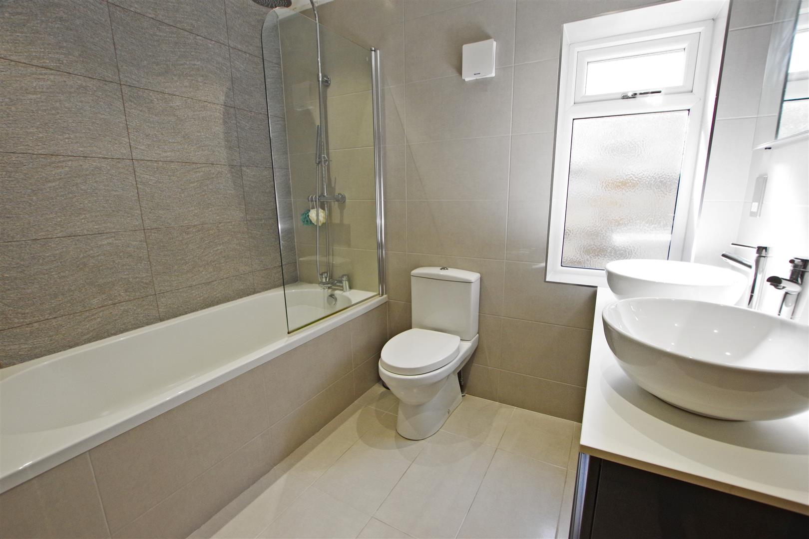 Bathroom - Bath with mixer taps and shower over. Twin vanity wash hand basins. WC. Fully tiled. Extractor fan. Chrome towel radiator. UPVC double glazed window to side elevation.