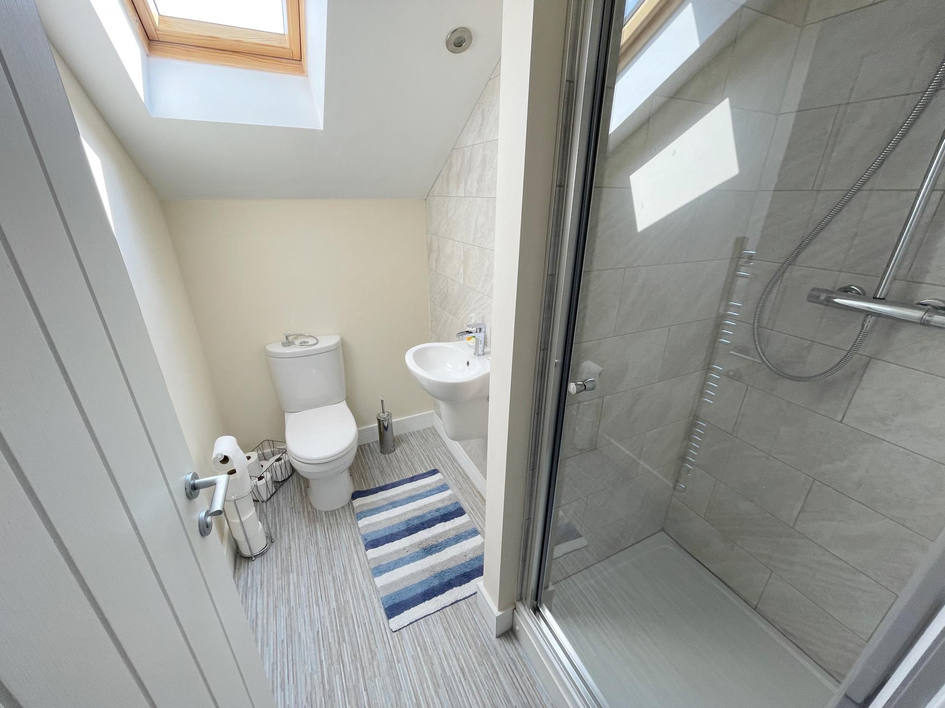 With Velux style window, part tiled walls, inset spotlights and three piece suite comprising shower cubicle with shower, wash hand basin and low flush wc.