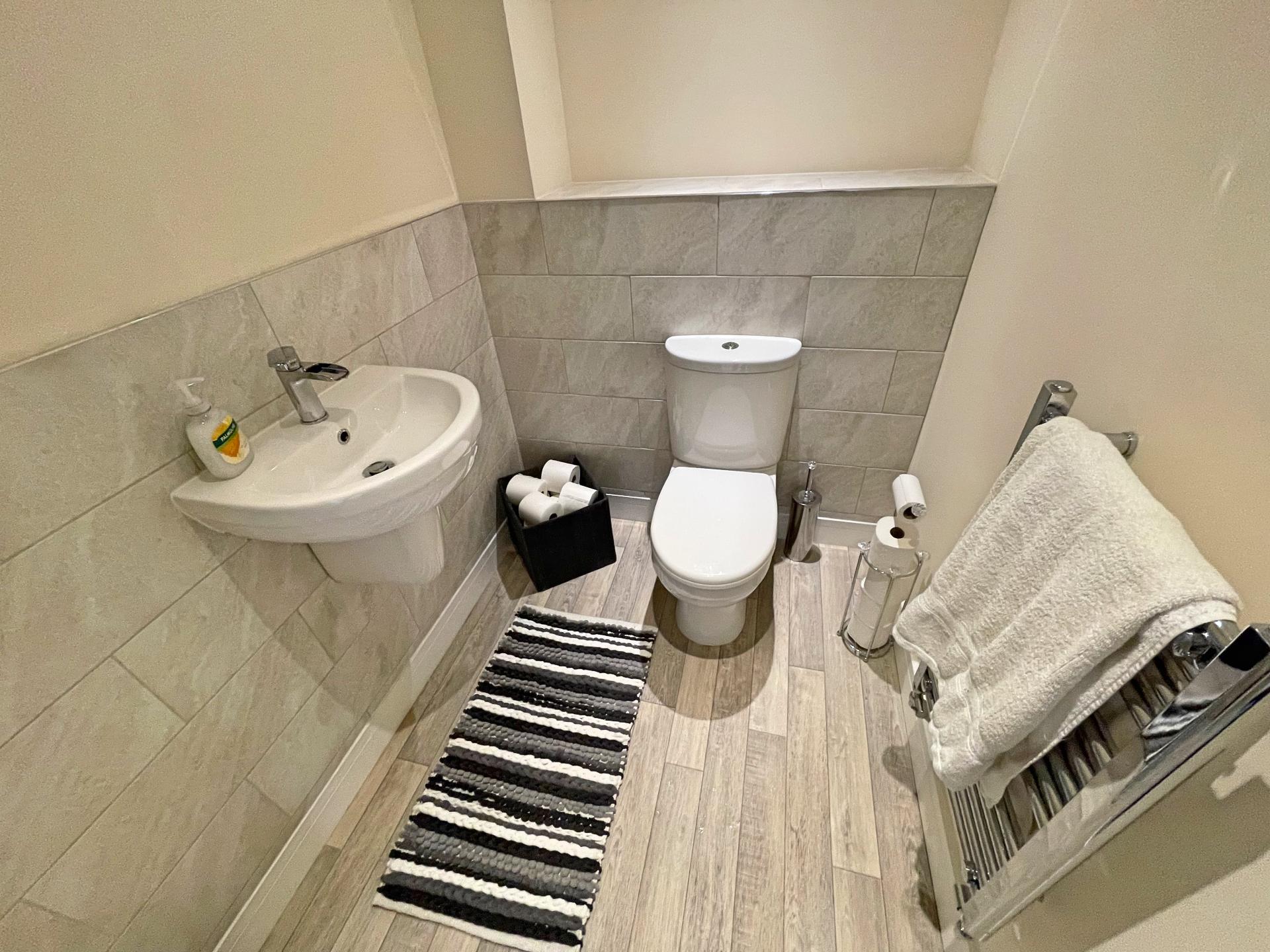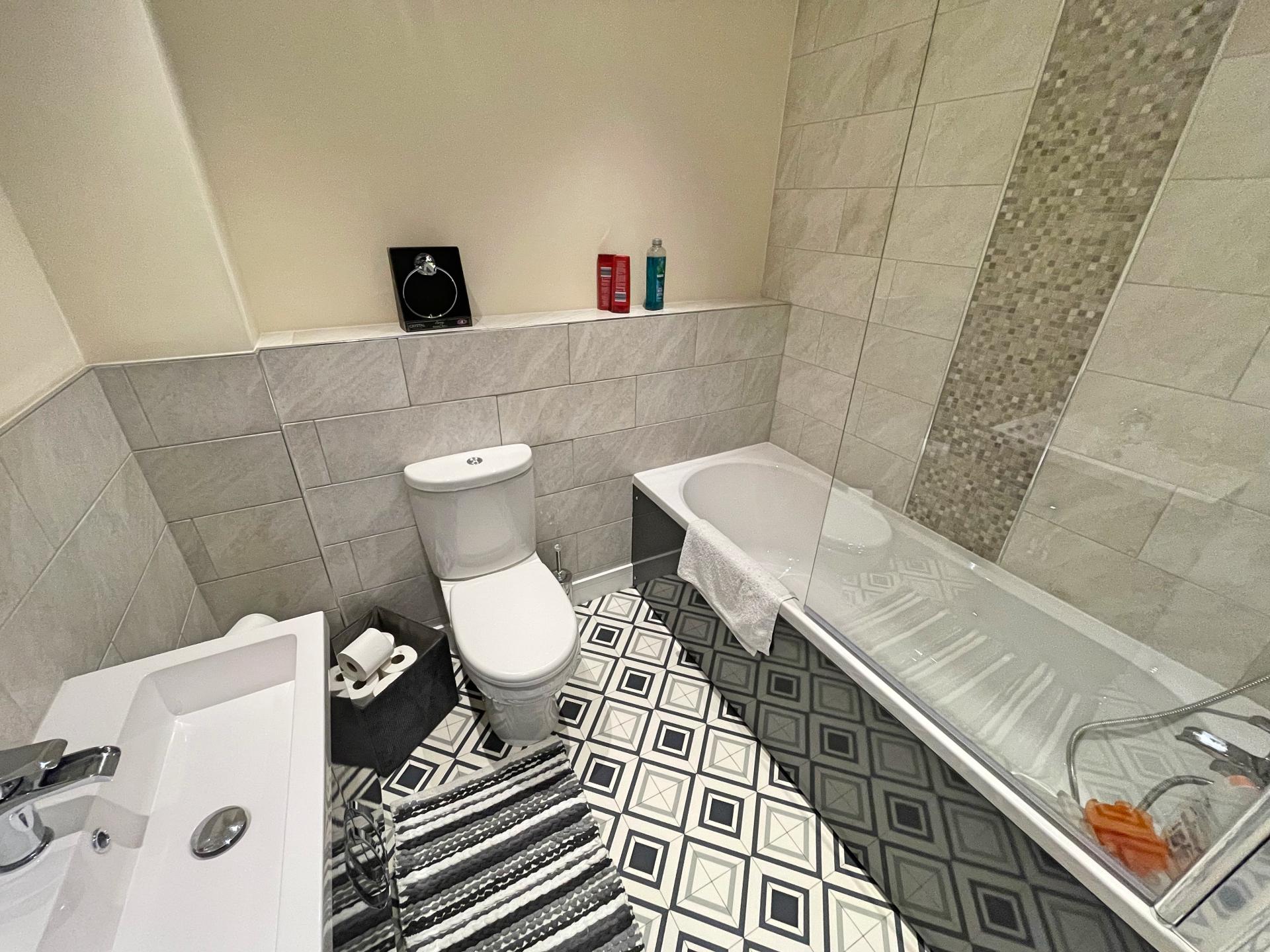 With contemporary tiling to dado level, heated towel rail, ceiling light point and two piece suite comprising wash hand basin and low flush wc.