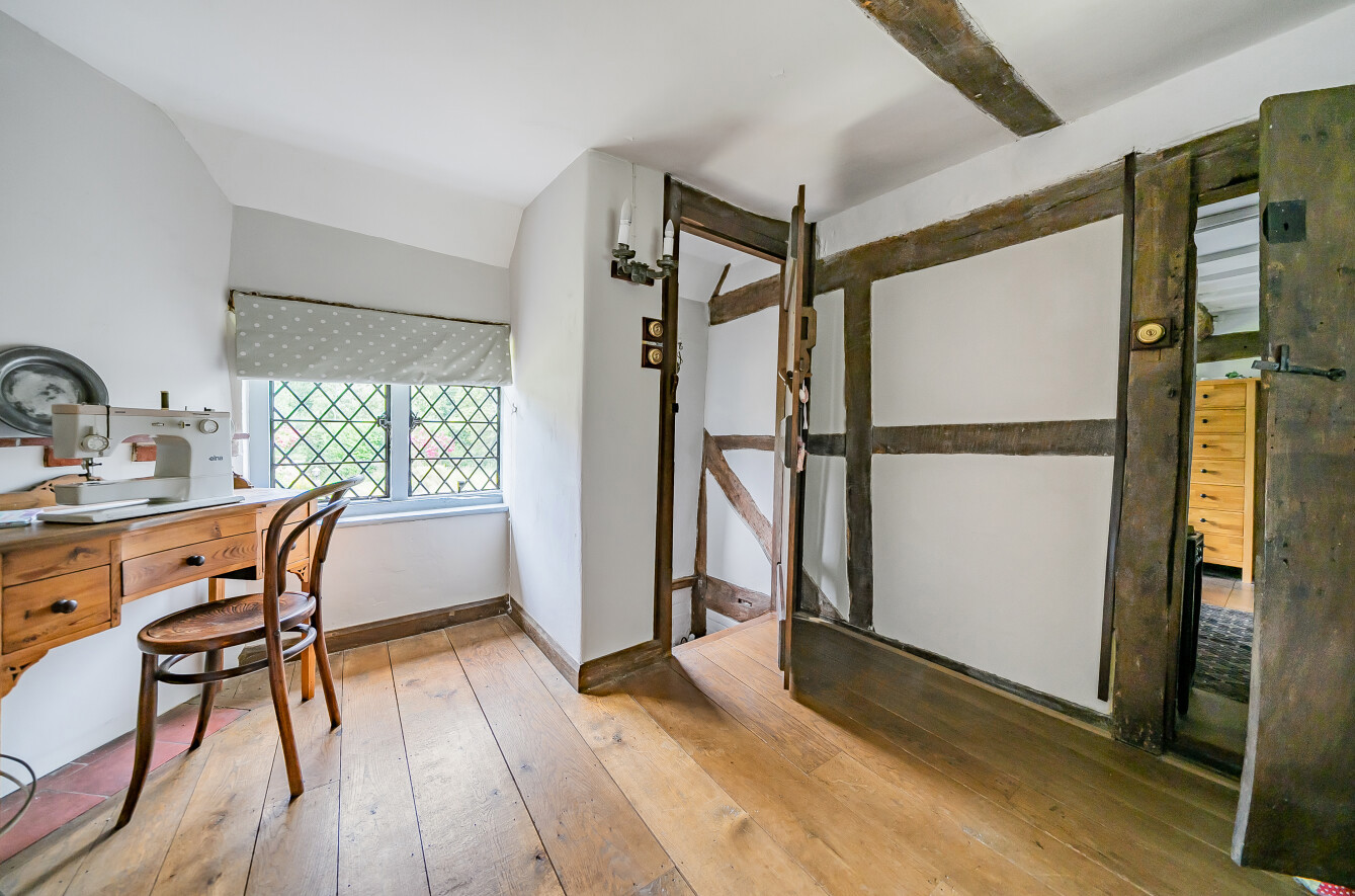 Upstairs, there are three characterful double bedrooms and a bathroom, all showcasing historic beams and wooden floors. The principal bedroom boasts a high, vaulted ceiling. An ancient door leads from the second bedroom to the third, although a second staircase provides independent access to the third bedroom. The bathroom is fitted with modern Roca fittings, including a freestanding bath and a separate walk-in shower.