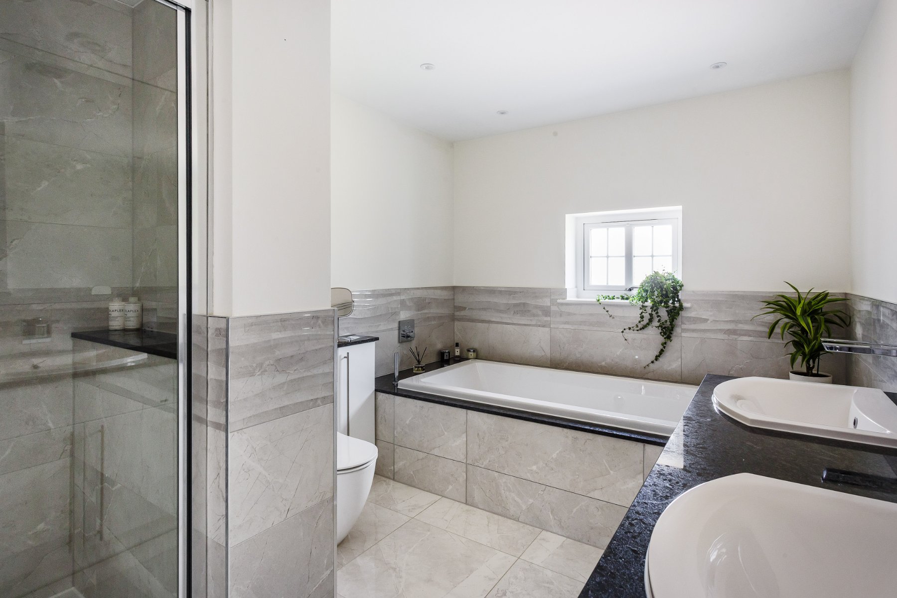 - Bathrooms with modern white suites