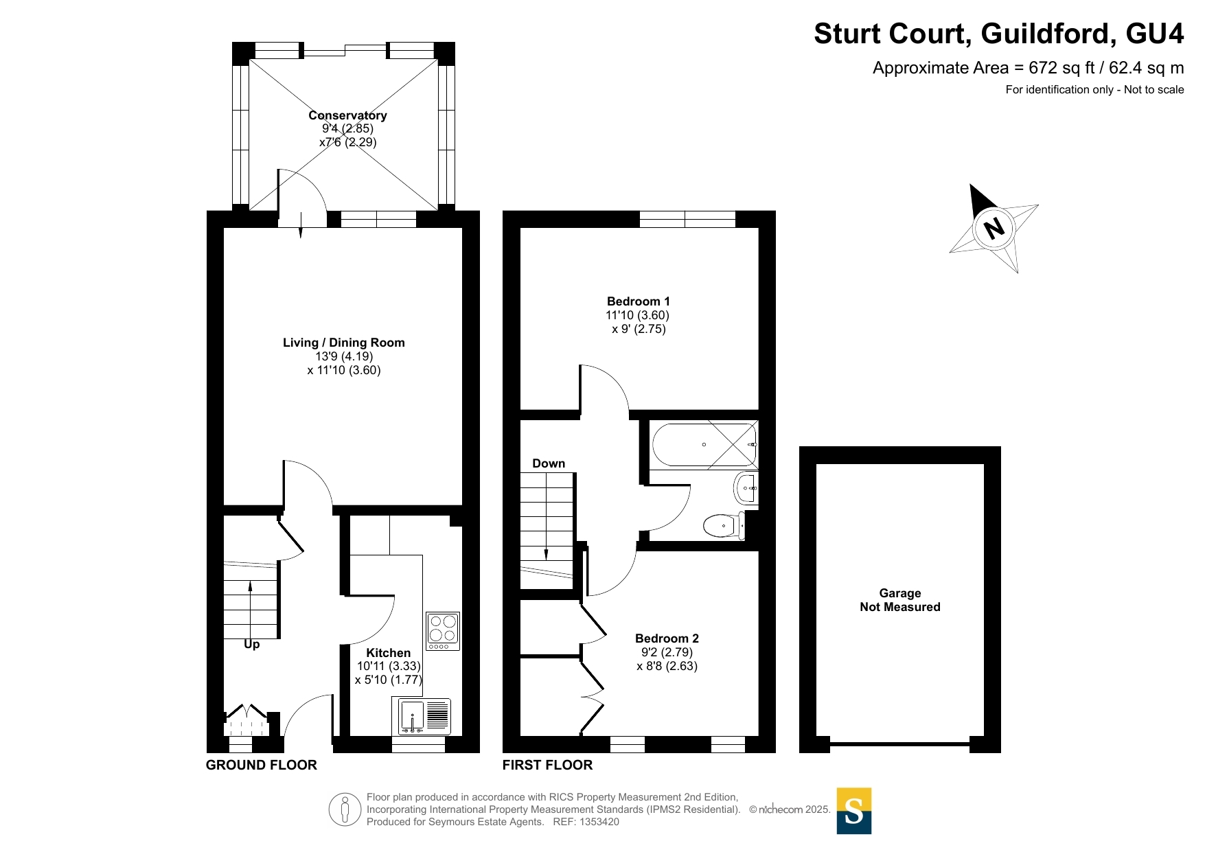 This charming two-bedroom terraced house, recently redecorated, is located in the sought-after Merrow Park area, offering convenient access to Guildford town centre while being close to excellent local schools. The property is tucked away in a cul-de-sac with no through traffic, creating a quiet and safe setting. It also benefits from its own garage with a private drive, situated approximately 15 metres from the property within a block of four garages, a rare and valuable feature.Approached via a neat path with slate chippings on either side, the home has a tidy and welcoming first impression. Inside, the property is well-presented and neutrally decorated, allowing a new owner to move straight in. The bright and airy living room, finished in a soft cream décor with light laminate flooring, opens through a glass door into the conservatory. This additional living space enjoys full views of the garden, creating a peaceful setting filled with natural light. The garden itself is enclosed with fencing, ensuring privacy, and is neatly maintained.The modern kitchen is both stylish and practical, fitted with crisp white cupboards and marble-effect countertops, providing generous workspace for meal preparation.Upstairs, the two bedrooms have been redecorated in calming beige tones with wood-effect flooring, creating a warm and inviting atmosphere. The second bedroom also benefits from built-in wardrobes for convenient storage. The bathroom has been modernised with elegant marbled tiling and sleek white fittings. The bathroom also features a power shower, supplied by its own pump located in the attic, providing excellent water pressure. The attic itself offers additional practicality, with part of it boarded for storage and fitted with mains-powered lighting.A further key advantage is that this property is offered with no onward chain on the seller's side, making the moving process simpler.This house offers a well-balanced blend of comfort, style, and practicality in a highly desirable location, ideal for first-time buyers, downsizers, or young families alike.
