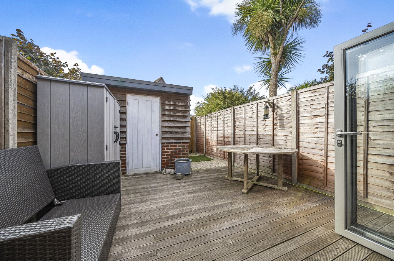 Outside, the rear garden enjoys a south-facing aspect and is laid to decking for ease-of-maintenance. There is a brick-bult garden store, and gated access leads to the rear.