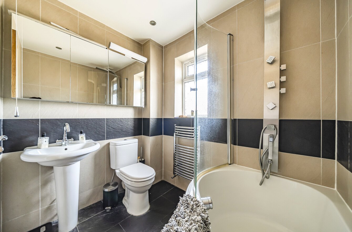 Upstairs there are two double bedrooms, the rear-aspect room benefitting from a range of fitted wardrobes. The family bathroom is fitted with a modern white suite.