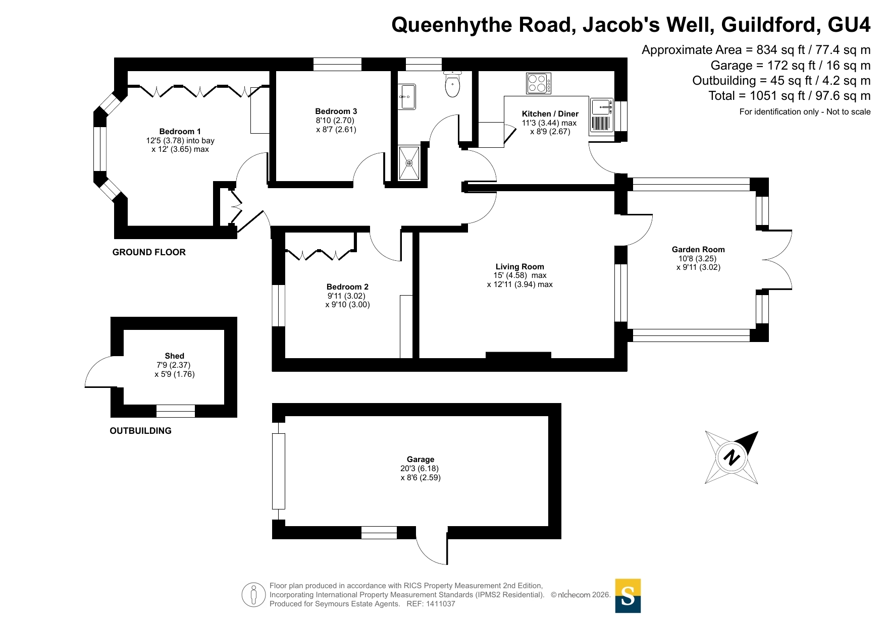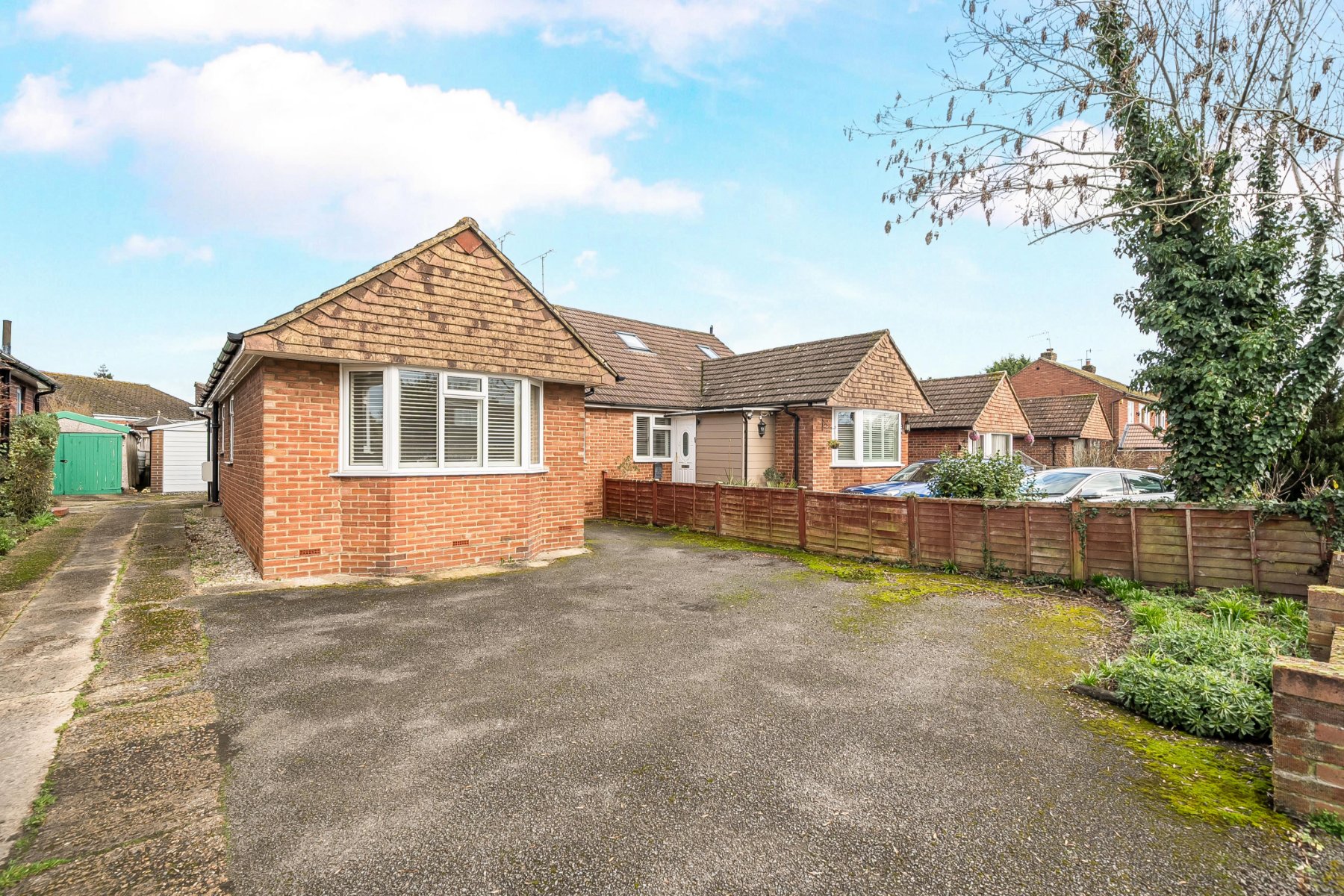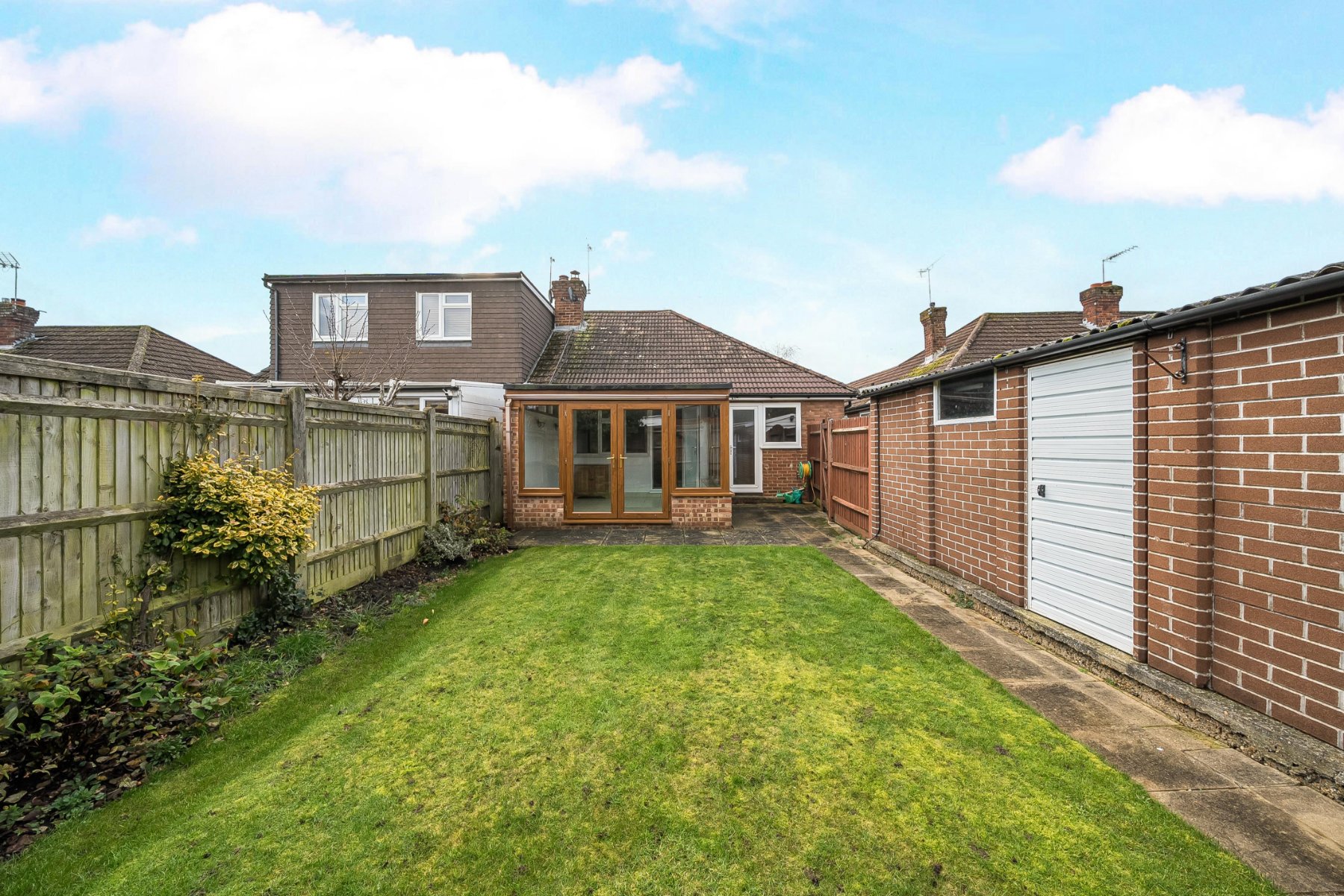 The home opens into a central hallway that connects the principal rooms, creating a natural flow throughout the home. The living room is bright and welcoming, featuring a traditional fireplace as a focal point and large glazed doors that lead through to the garden room, allowing plenty of natural light to fill the space.The kitchen is arranged in a functional layout with ample wall and base units, generous worktop space, and integrated appliances. There is room for casual dining, making it a sociable and practical area for everyday living. Adjacent to the kitchen and living room, the garden room provides an additional reception space with views over the rear garden and direct access outside, ideal for relaxing or entertaining.The bungalow offers three bedrooms, providing flexibility for family living, guests, or a home office. The main bedroom benefits from a bay window that enhances the sense of space and light, while the remaining bedrooms are well proportioned and conveniently positioned near the bathroom.Outside, the property includes a detached garage and a separate outbuilding, offering excellent storage or workshop potential. The garden provides a pleasant outdoor setting with space for seating and planting. Situated in the popular village of Jacobs Well, the home combines peaceful surroundings with easy access to Guildford and local amenities, making it an appealing choice for a range of buyers.