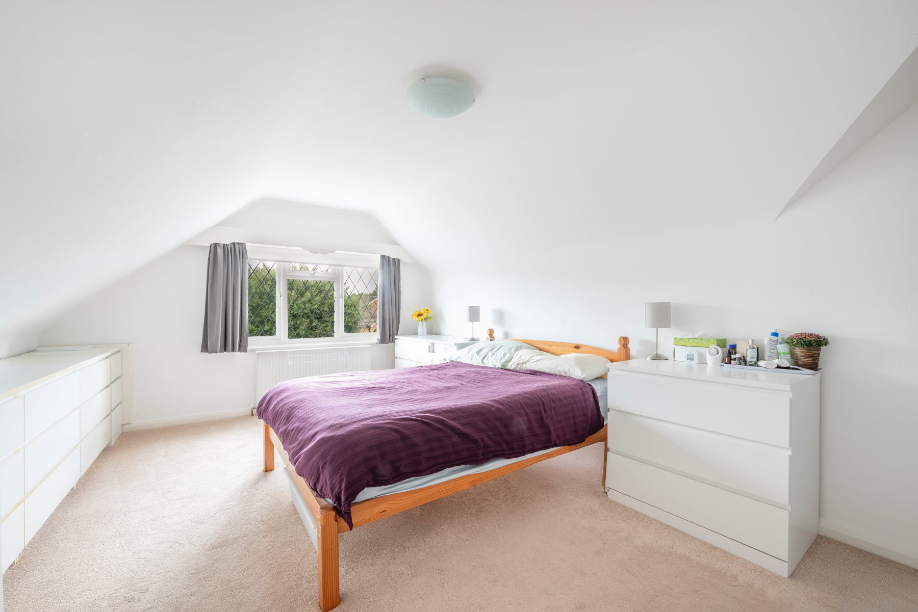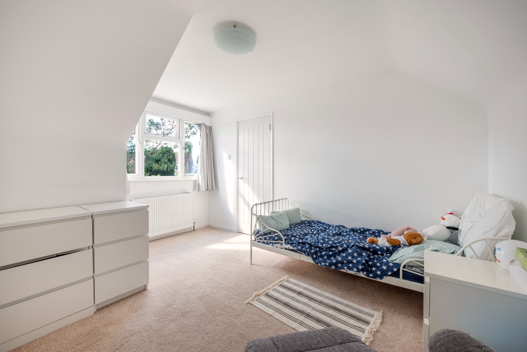 Upstairs, the largest bedroom boasts characterful slanted ceilings, built -in storage, white walls, and soft carpets, making it both practical and stylish. The second upstairs bedroom follows the same design theme and benefits from access to the large eaves storage. The family bathroom is finished with white tiled walls, sandy -toned flooring, and crisp white fittings, giving it a clean and contemporary feel.
