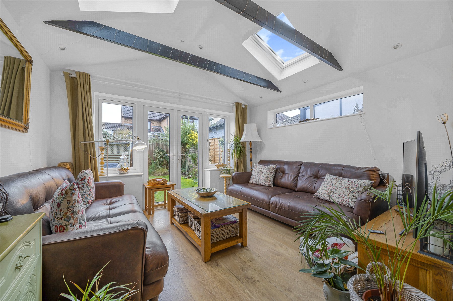 The front door opens into the first of the reception spaces which is currently used as the dining room, and continues through to a further reception area, ideal for use a study area or dining space. A particular feature of the property is the superb garden room, currently in use as a living room, with vaulted ceiling, skylight windows and French-style doors providing access onto the garden. The kitchen is fitted with a range of Shaler-style eye and base level units comprising space for a range-style cooker, slimline dishwasher and washing machine.