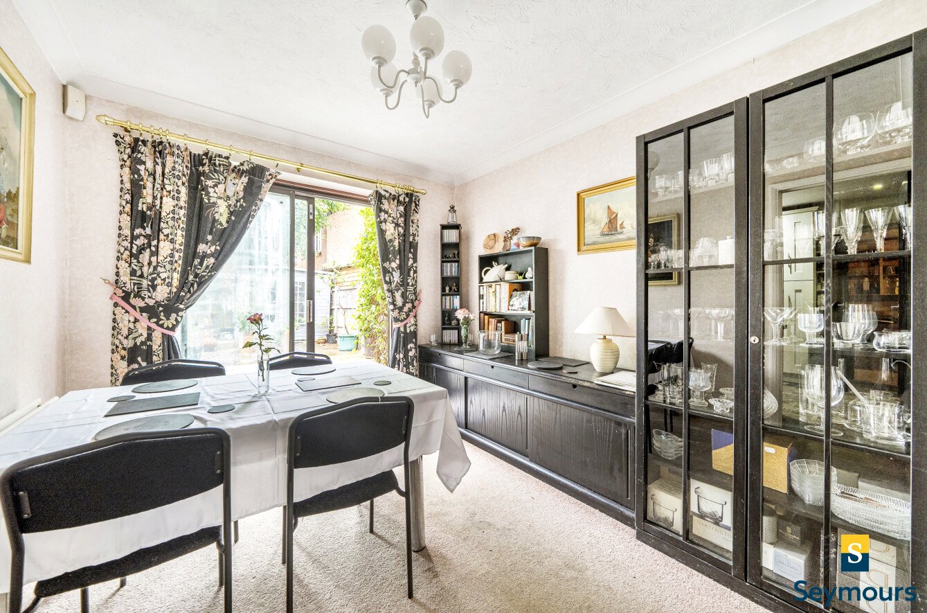 Inside, the kitchen features elegant cream shaker style cabinets complemented by black countertops. There is plenty of cupboard space, along with a double oven that adds to the kitchen's practical appeal. The living room is decorated in soothing taupe tones and benefits from natural light streaming through diamond leaded windows at the front. Double doors open into the dining room, where views of the rear garden are framed by large sliding glass doors, creating a lovely indoor-outdoor flow.