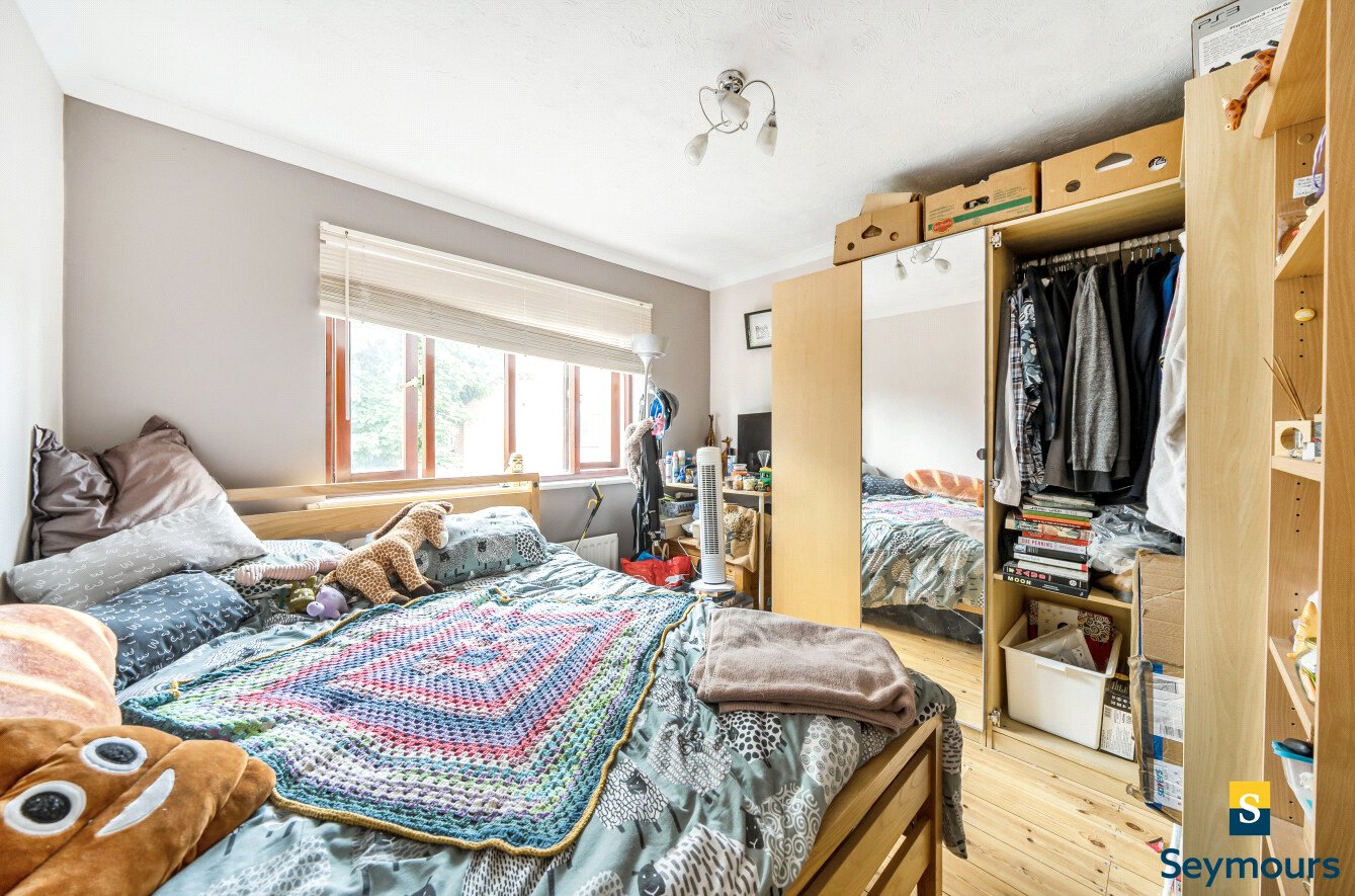 Upstairs, the main bedroom has warm wood flooring and built in wardrobes with large mirrored sliding doors, enhancing the sense of space and reflecting light from the windows. The en-suite bathroom is stylishly appointed with dark slate tiled walls and crisp white fittings. The second bedroom is generously sized and finished with similar wooden floors and taupe coloured walls, a theme echoed in the third and fourth bedrooms. The family bathroom is smartly finished with white tiled walls, black floor tiles and white sanitary ware.