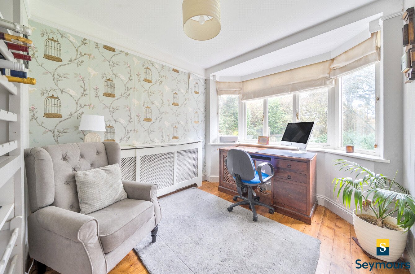 The ground floor offers a superb balance of generous living and flexible working space. The main living room is a wonderfully bright and welcoming environment, enhanced by large windows overlooking the garden and a feature fireplace that adds warmth and personality. Its generous proportions allow for multiple seating and entertaining areas, making it a natural focal point for family life. The separate study sits just off the hallway and is ideal for those working from home, benefiting from a charming bay window that frames garden views and fills the room with light. The heart of the home is the spacious kitchen and dining room, where classic cabinetry, ample storage and extensive preparation space create a stylish and practical setting for everyday living. With plenty of room for family dining and relaxed seating, it is a space designed for gathering and entertaining. A useful ground-floor cloakroom completes the layout.