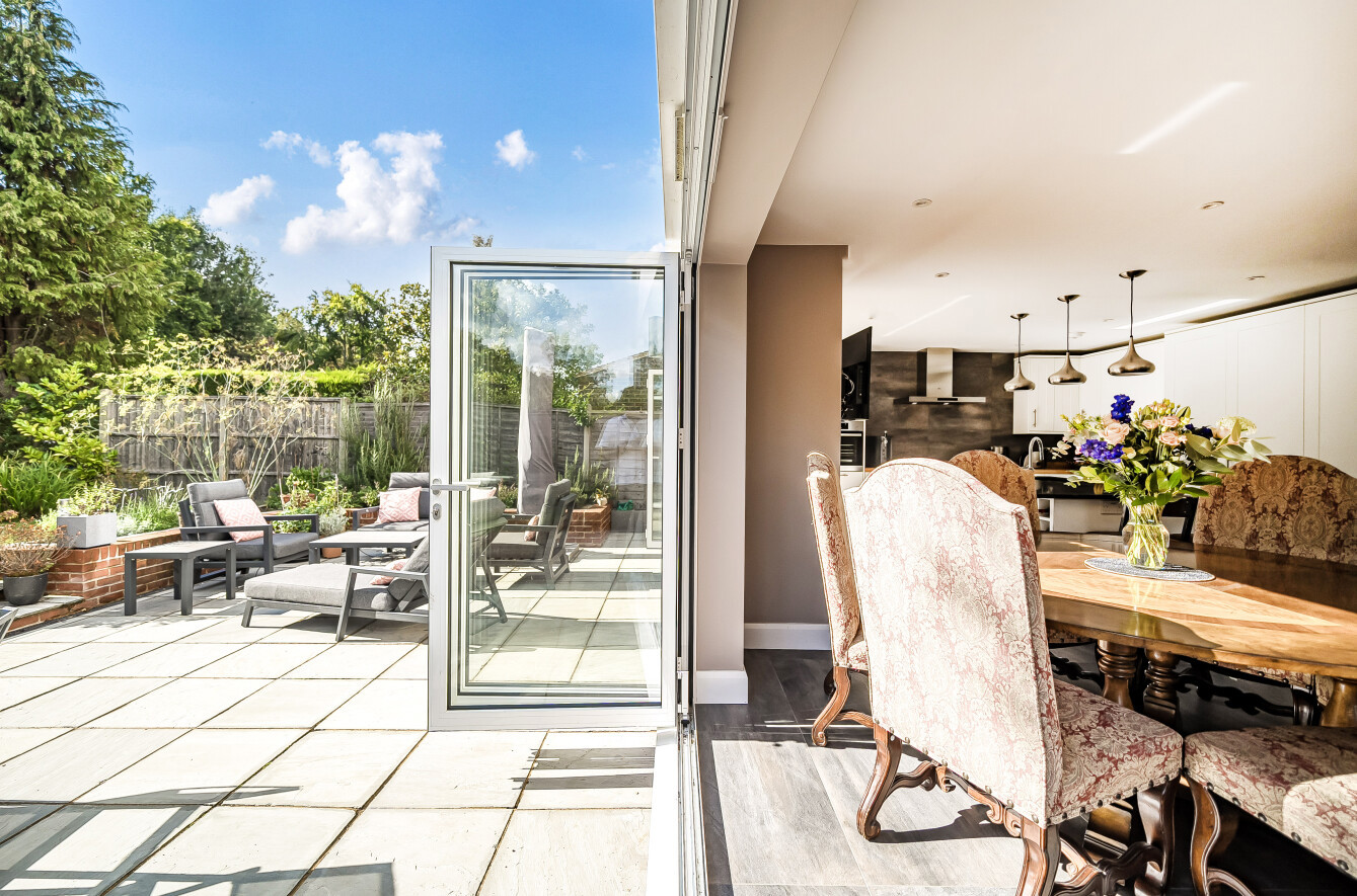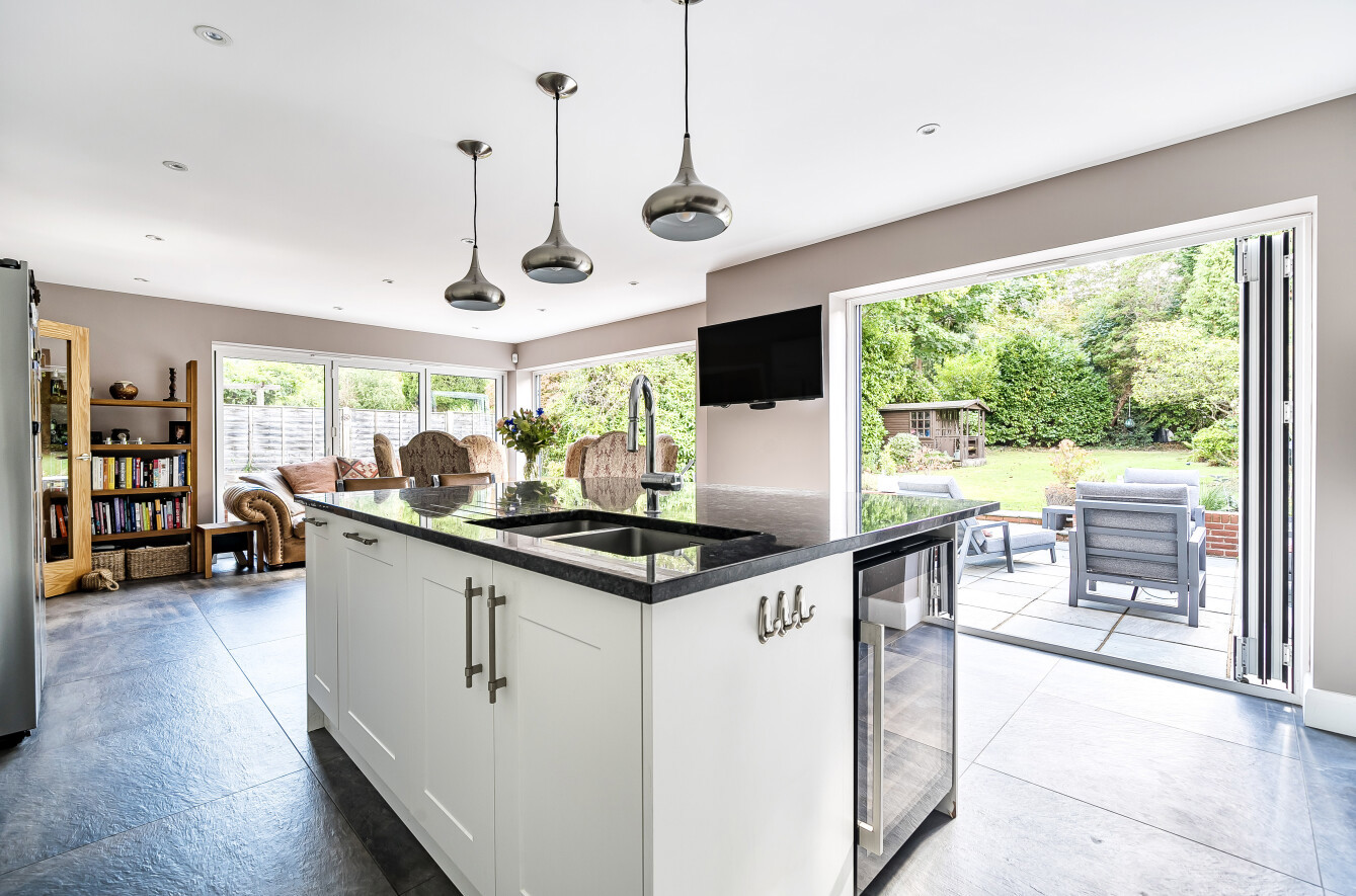 The heart of the home is undoubtedly the impressive kitchen and dining room. Finished with shaker style cabinetry and sleek work surfaces, this stylish space has been designed with both everyday living and entertaining in mind. A central island provides a focal point, while the generous proportions ensure plenty of room for family dining or hosting friends. With double aspect bi-fold doors drawing in natural light, the kitchen and dining area feels bright and inviting throughout the day.