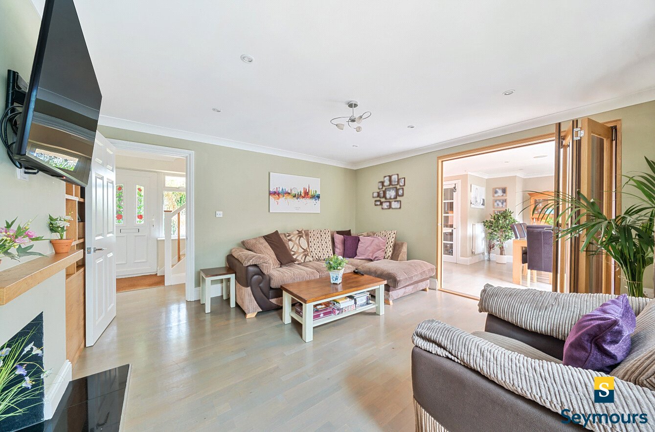 The main sitting room is generously proportioned and features a warm, neutral decor, with double doors opening onto a conservatory that works beautifully as a study or reading area. The layout is practical and versatile, allowing spaces to connect seamlessly for family living while still offering areas of privacy when needed.