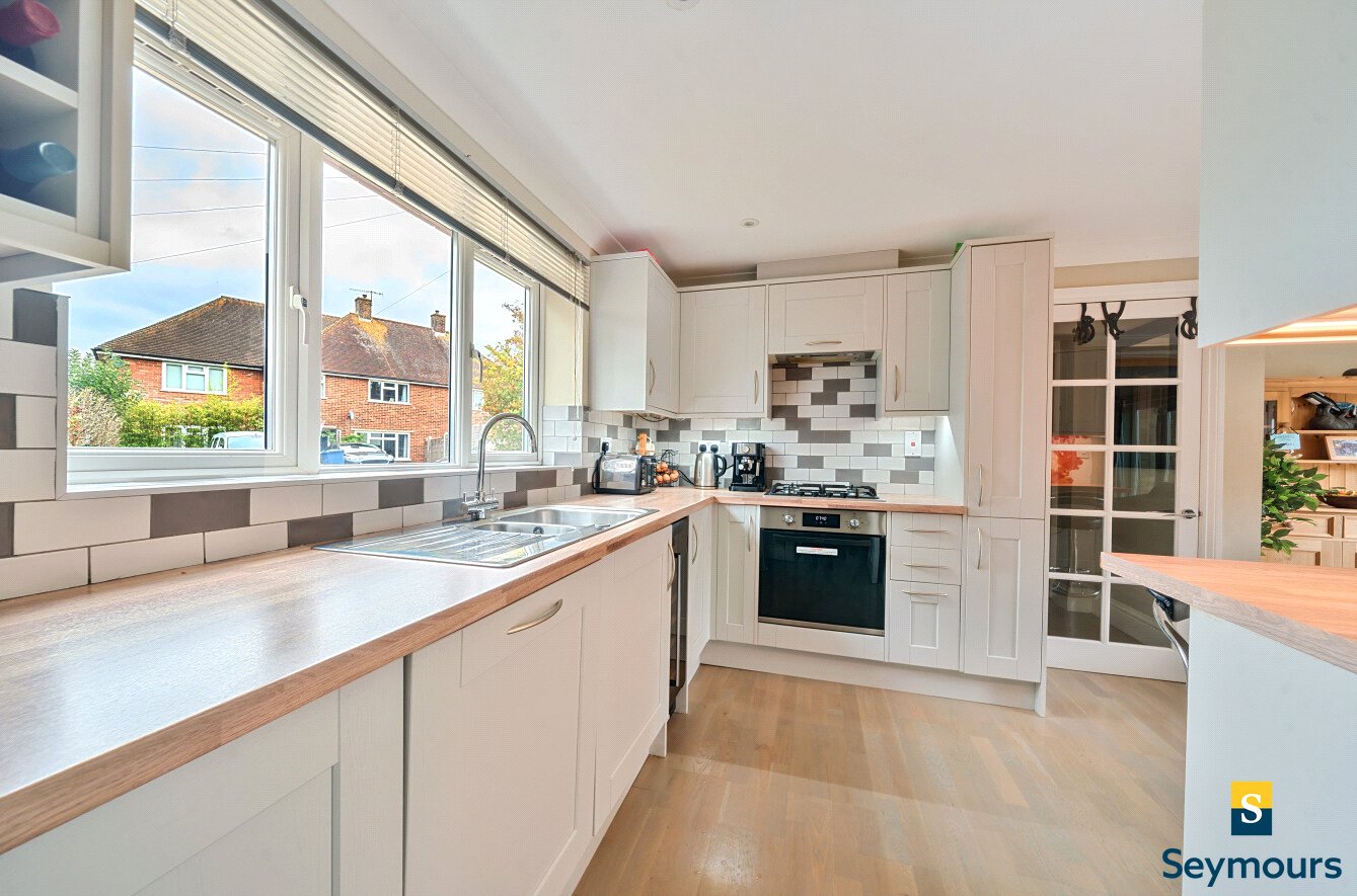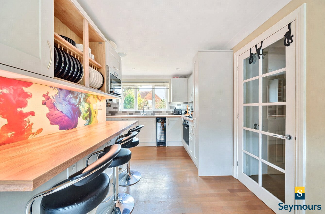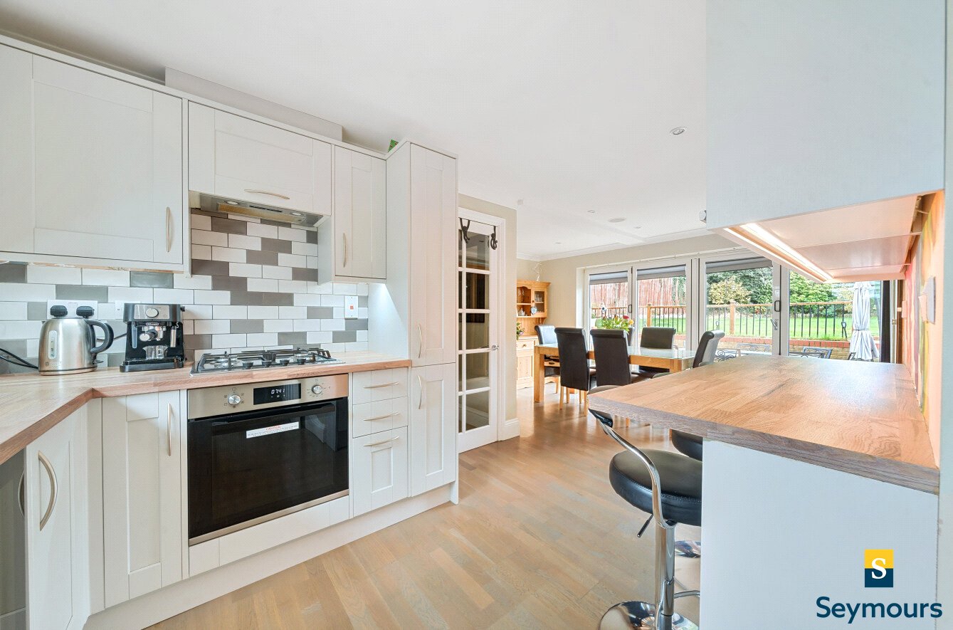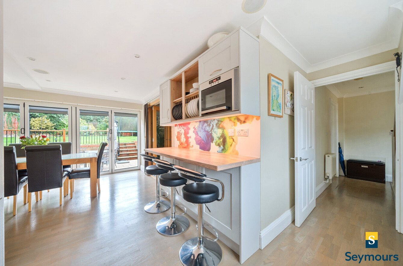 The property opens with a bright and welcoming hallway leading into spacious living areas. The kitchen is stylishly fitted with a range of modern units and integrated appliances, complemented by wooden worktops and tiled splashbacks. It flows into a large dining area where French doors frame views of the garden, filling the space with natural light and making it perfect for both everyday family use and entertaining. There is also a useful breakfast bar with seating, adding a relaxed social element to the kitchen.