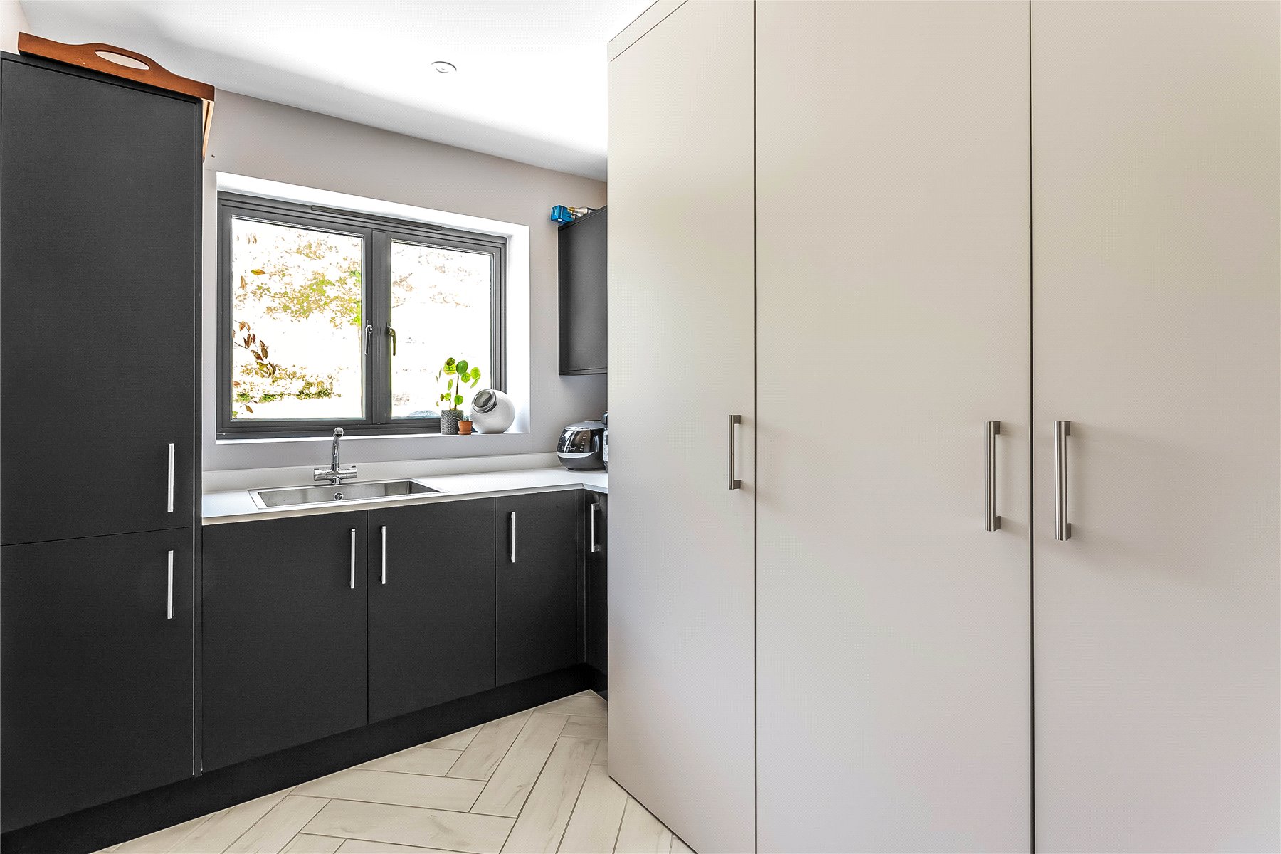 The welcoming entrance hallway gives access to the lounge, study, WC and kitchen diner. The main reception room comes with attractive log burner and patio doors that lead directly to the front garden and secluded patio area. The property benefits from a stunning open plan kitchen/dining and family room which is modern and bright with under floor heating, bespoke contemporary kitchen units, impressive breakfast bar and with bi-fold doors leading out to the beautiful rear garden. There is a separate utility room, offering ample storage space, sink, white goods and a further ground floor bedroom with an en-suite shower room. There is side access to the property through the utility room.
