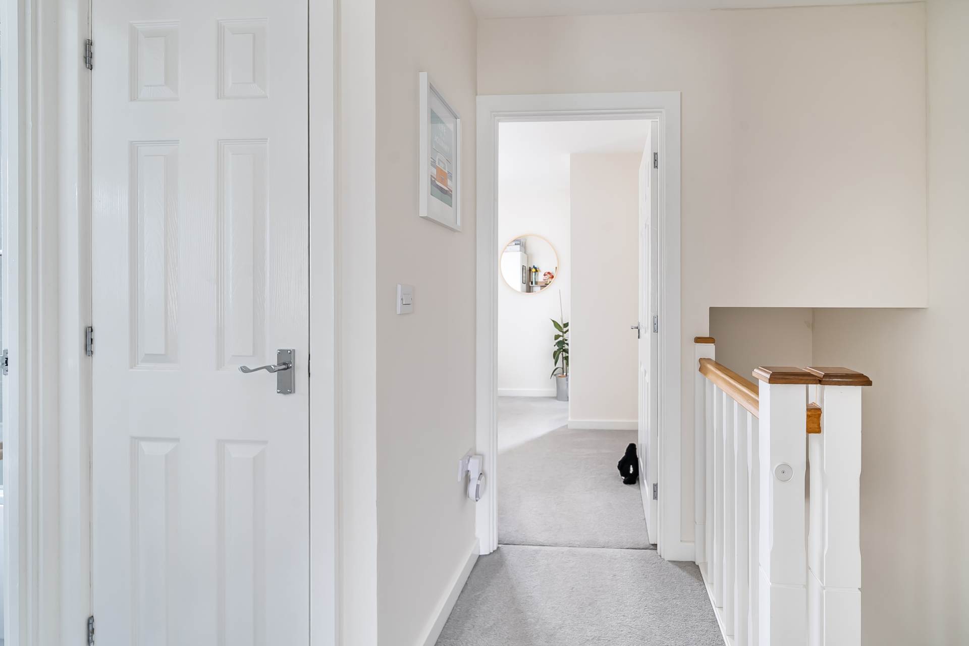 This modern semi detached house is approached via a pathway and steps leading up to the Storm Porch. Entrance door opens to the Hallway with stairs rising to the first floor. Useful ground floor Cloakroom comprising of low level WC and wash hand basin with tiled splashback.The main reception room the Lounge, is spacious and where extensive views across surrounding and far reaching countryside and the River Tamar can be enjoyed. It has a useful under stairs storage cupboard. The Kitchen/Breakfast room follows, which is always a popular choice especially for families. The kitchen area is fitted with a range of coloured high gloss cabinets and there are square edged, marble effect work top surface. 4 ring stainless steel gas hob with electric oven beneath and stainless steel canopy above. Under unit lighting, drawer space, pan drawers, built in fridge freezer, washing machine and dishwasher. Area suitable for dining room table and chairs and French doors give access to the rear.