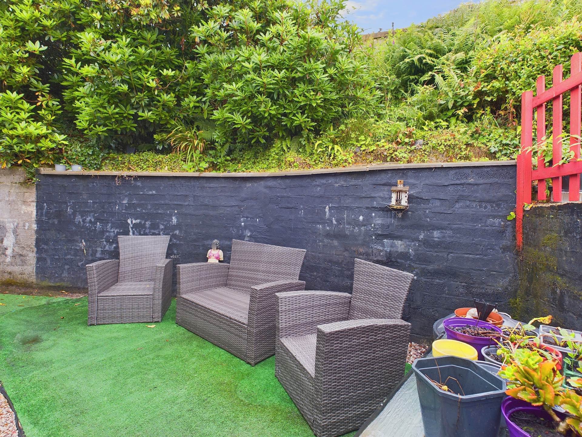 To the front there is a parking space for 1 vehicle, composite decking and balcony, fencing artificial lawns, bank with steps leading to attractive flower shrub beds and borders. To the left-hand side of the property there is further car parking space, garage with an electric up and over door, power and light. Gate and pathway leading to the side.