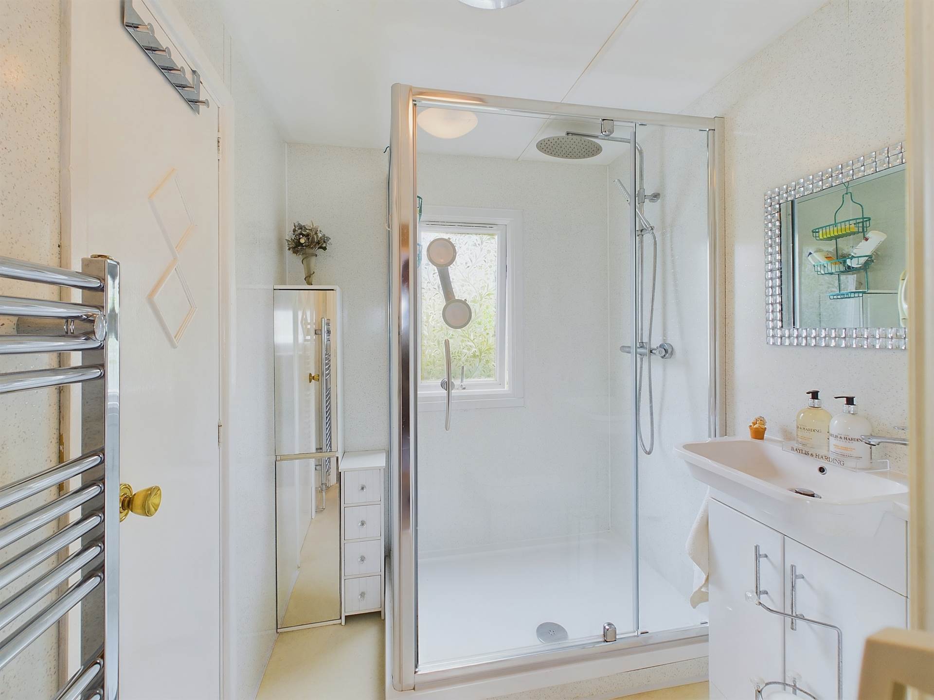 Comprising of vanity unit incorporating low level WC, wash hand basin and cabinets below. Over sized shower cubicle housing the bar shower with 2 heads, enclosing screen and sliding door, tray. Upvc double glazed frosted window to the side elevation. Aqua waterproof wall covering, heated towel rail.