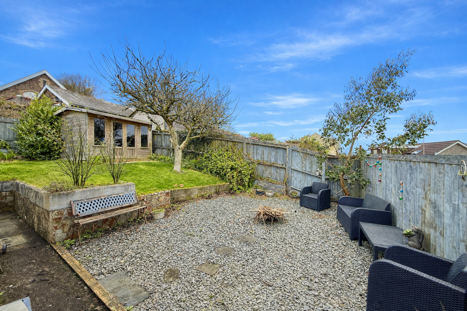 The property is accessed by a sloping path from the road leading to gate with access to the front garden which is laid to lawn separated by a path with steps up to a sun terrace enjoying views across the rooftops and countryside in the distance, the borders are stocked with mature shrubs and trees. There is a rear access lane giving access to a driveway with parking for three cars leading to the garage, security light, gravel border and path with gate gives access to the rear garden. A path to one side leads to the rear garden and the other opens up to a patio area with slate chippings, a path continues around to the rear. There are steps up to a raised lawn that extends across the rear and to the side with mature apple tree, a timber summerhouse with lighting