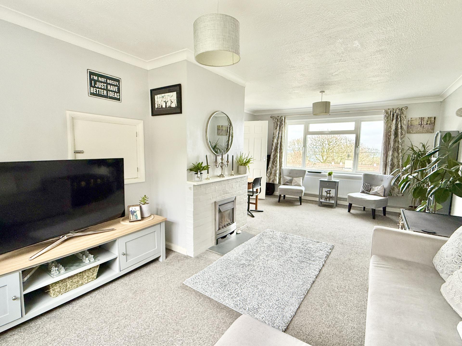 Dual aspect room with double glazed window to front enjoying views to the countryside in the distance, double glazed window to rear, fireplace with inset coal effect gas fire, coved ceiling, two radiators, wall lights, serving hatch to kitchen.