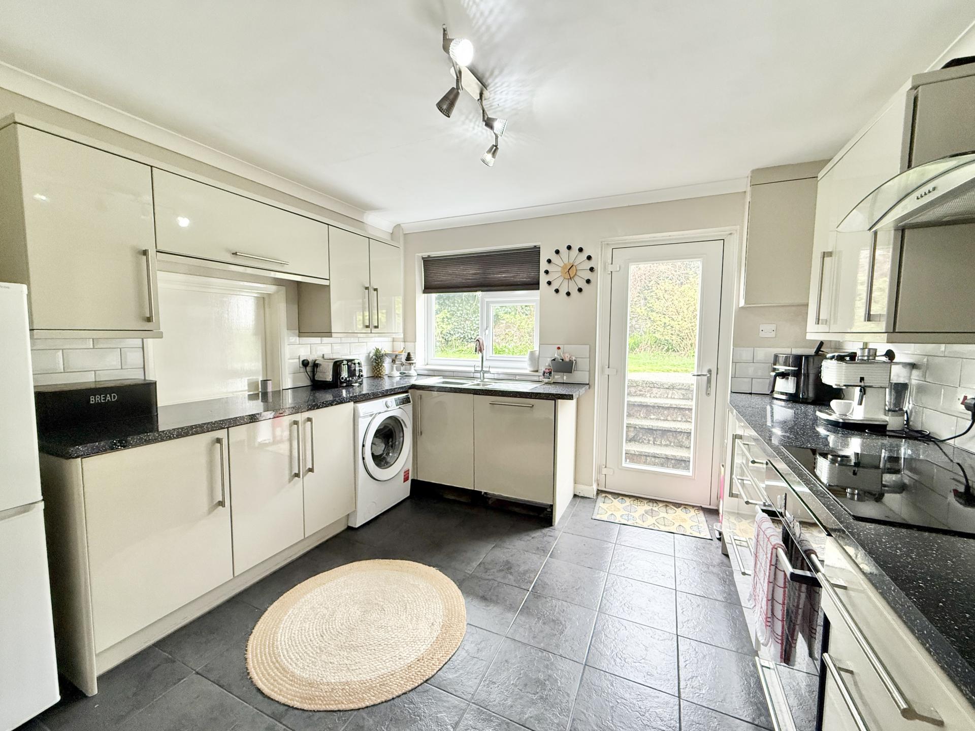 Fitted with a range of high gloss fronted base units and drawers under square edge work surfaces, matching wall cupboards and tiled surrounds, inset Bosch four ring electric hob with stainless steel splashback and cooker hood over, electric Bosch oven and grill under, inset one and a half bowl stainless steel sink unit with single drainer and mixer tap, plumbing for washing machine, space for fridge/freezer, integrated dishwasher, tiled floor, double glazed window to rear, double glazed door to garden.