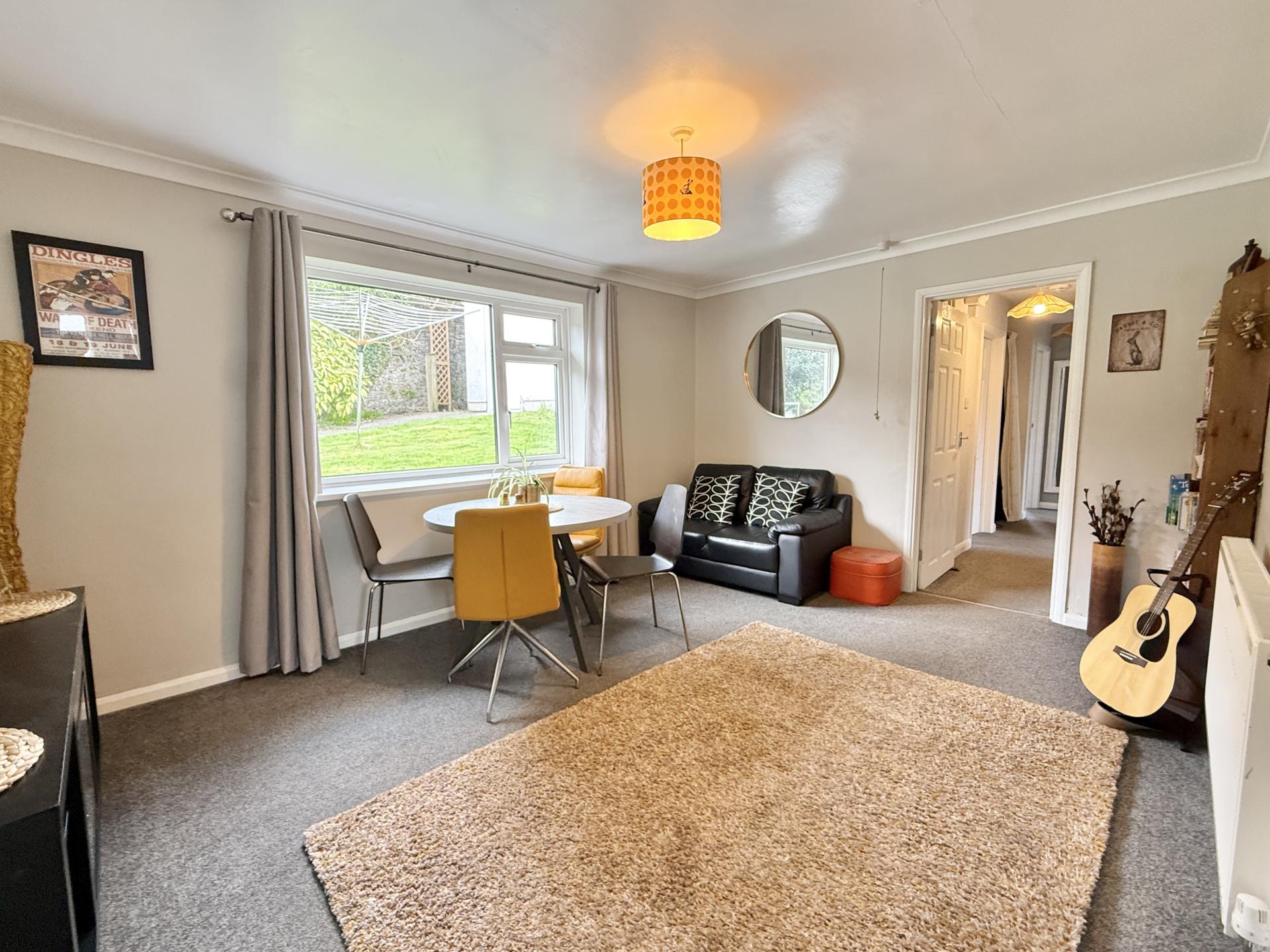 The gardens wraparound the bungalow and are mostly laid to lawn with mature borders. There is an entertaining area which has slate chippings for easy maintenance, with a summerhouse and mature apple tree. A path leads up to the single detached garage where there is also a driveway for three cars which is accessed via a small private lane. You can also access the bungalow from a paved path at the front.