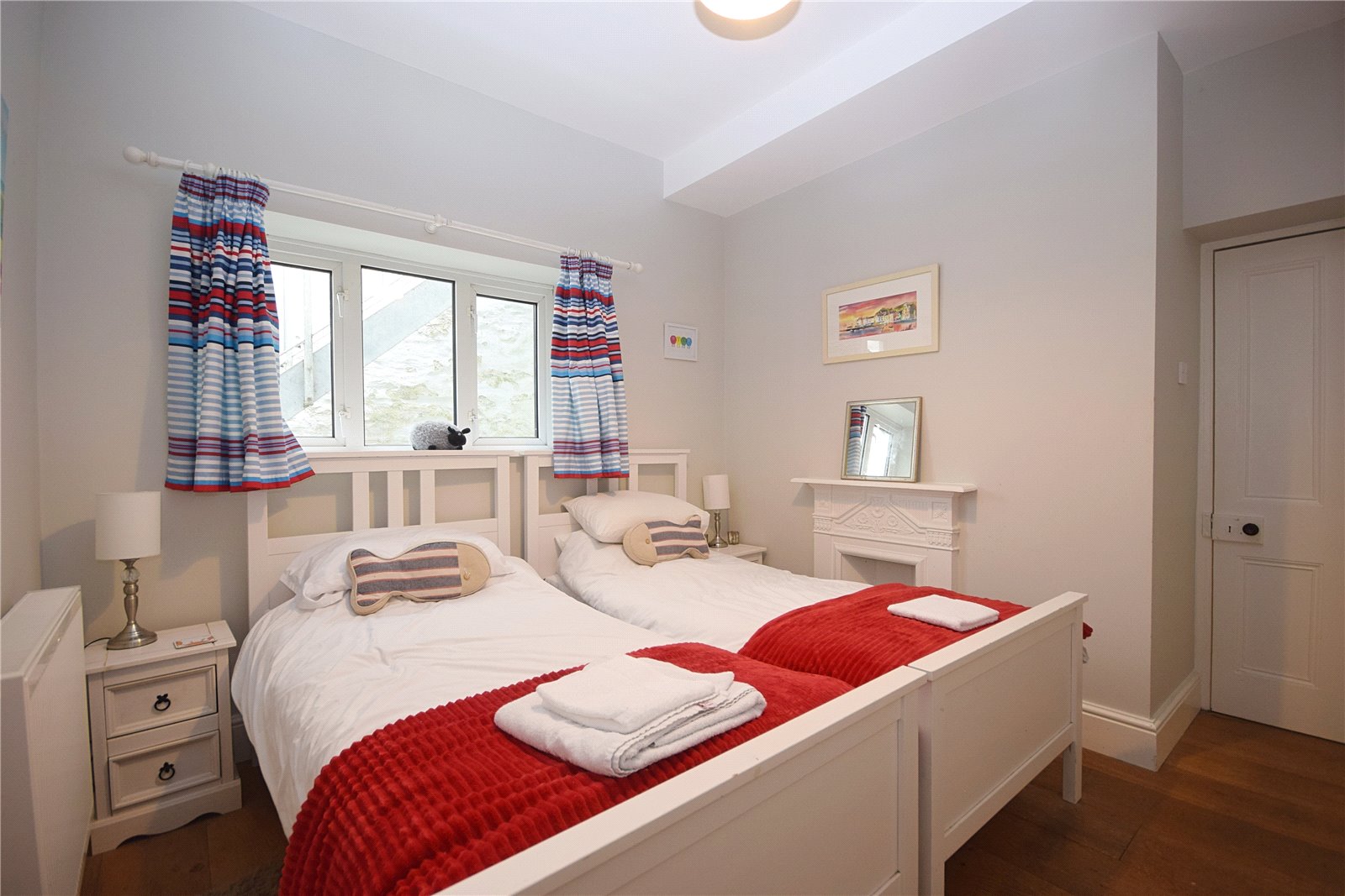The accommodation is approached via a shared entrance hall, with a private entrance door opening into the inner hallway. From here, the open-plan sitting room and kitchen create a welcoming living space. The sitting area features an exposed timber floor, a charming bay window with estuary views, and a feature fireplace, while the kitchen is fitted with a range of base and eye-level units, a stainless steel sink, a gas cooker point, and space for white goods.