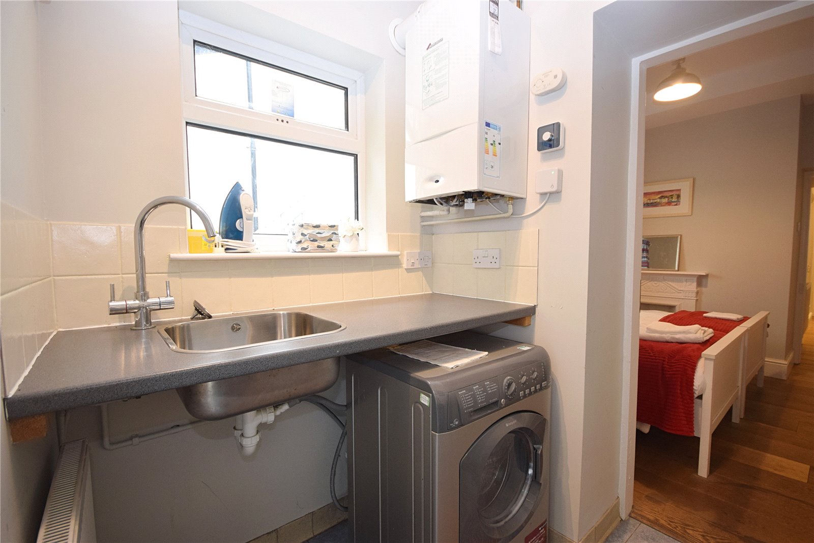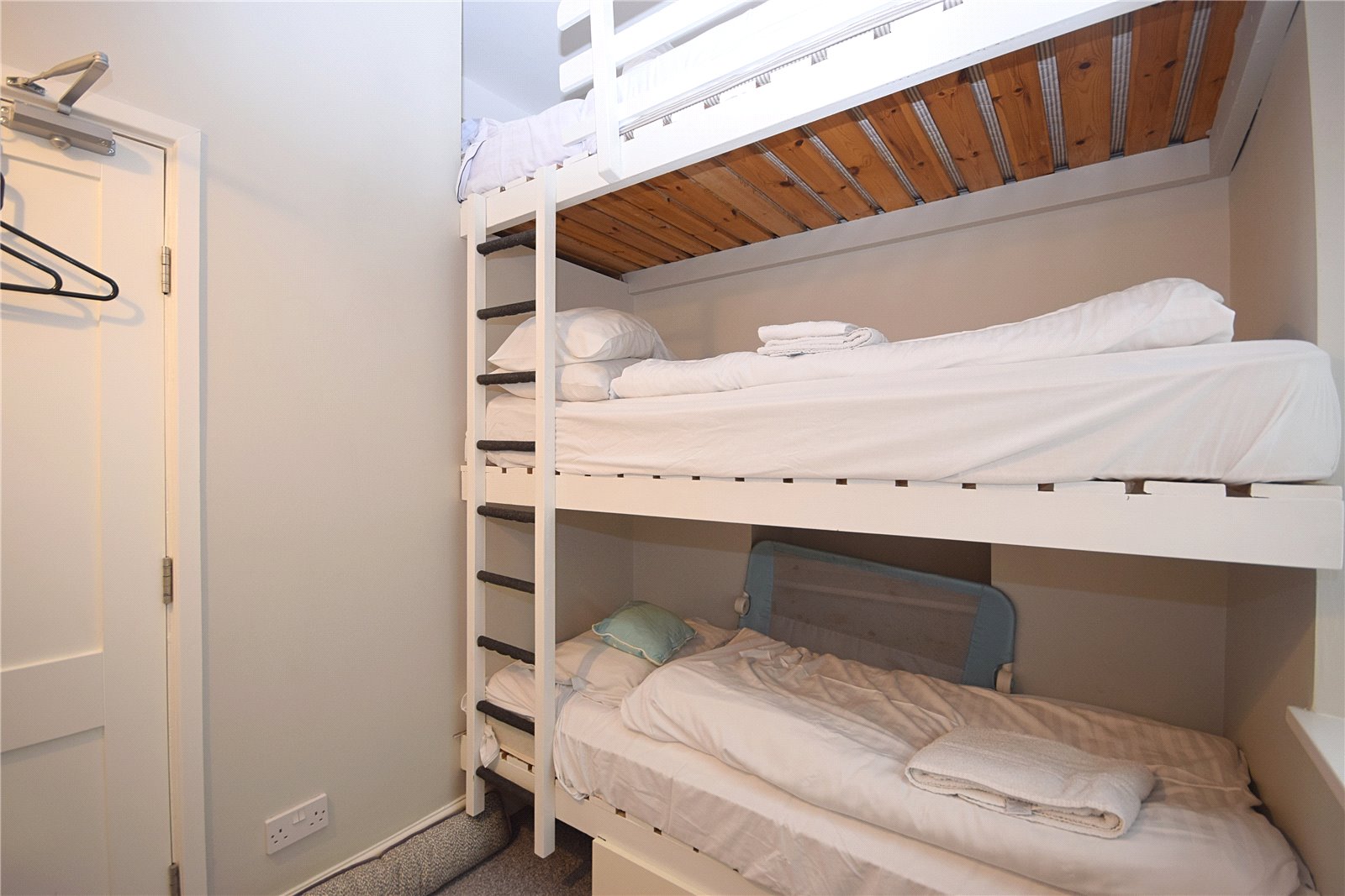 The apartment includes a double bedroom, a second bedroom fitted with a triple bunk, and a third bedroom that leads through to a rear porch and utility area with plumbing for a washing machine and a sink unit. The shower room is fitted with modern sanitary ware including a pedestal wash basin, WC, and mixer shower.