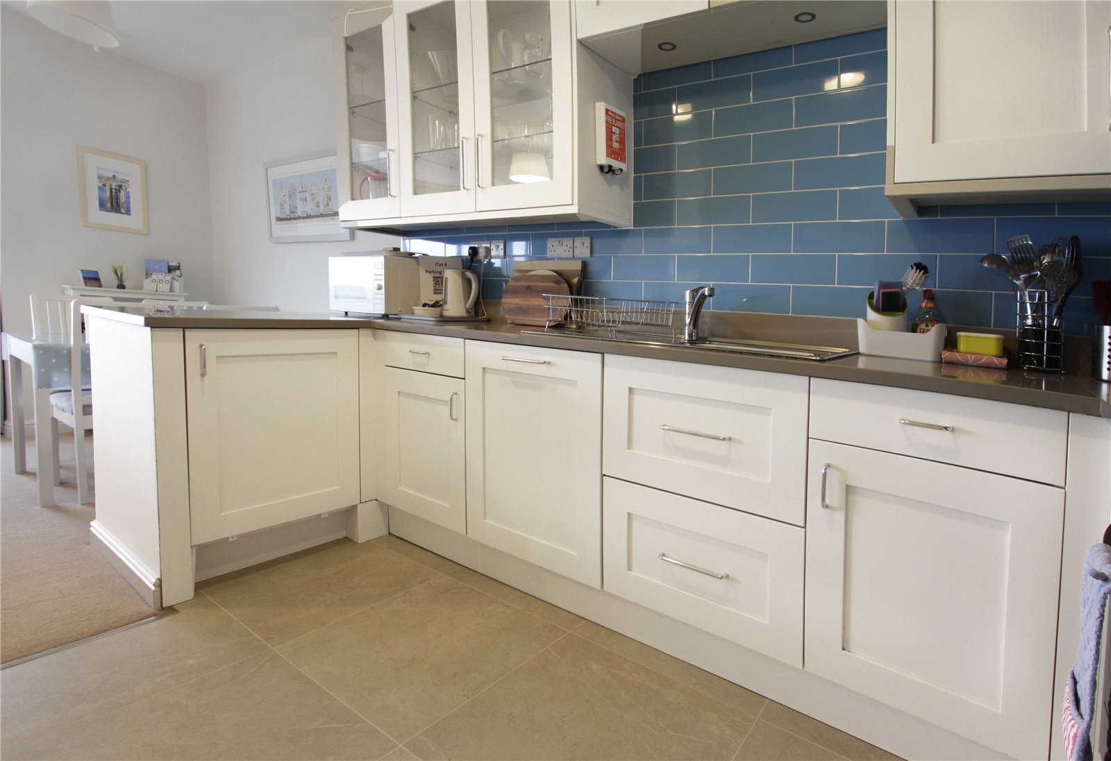 The property comprises of communal entrance hallway, with staircase leading to the second floor. The apartment opens into the entrance hallway, leading to a spacious, open plan kitchen living room, centred around a large walk in bay window taking full advantage of the sea and estuary views. The recently fitted kitchen comprises of a shaker style kitchen, with ample base and wall units, tiled splashbacks, under cupboard lighting and quartz stone worktops. The kitchen benefits from integral appliances including single electric oven, with four ring gas hob, full size dishwasher and undercounter fridge. The living room has been tastefully modernised, centred around the walk-in bay window, with two built in storage cupboards adjacent to the former fireplace.