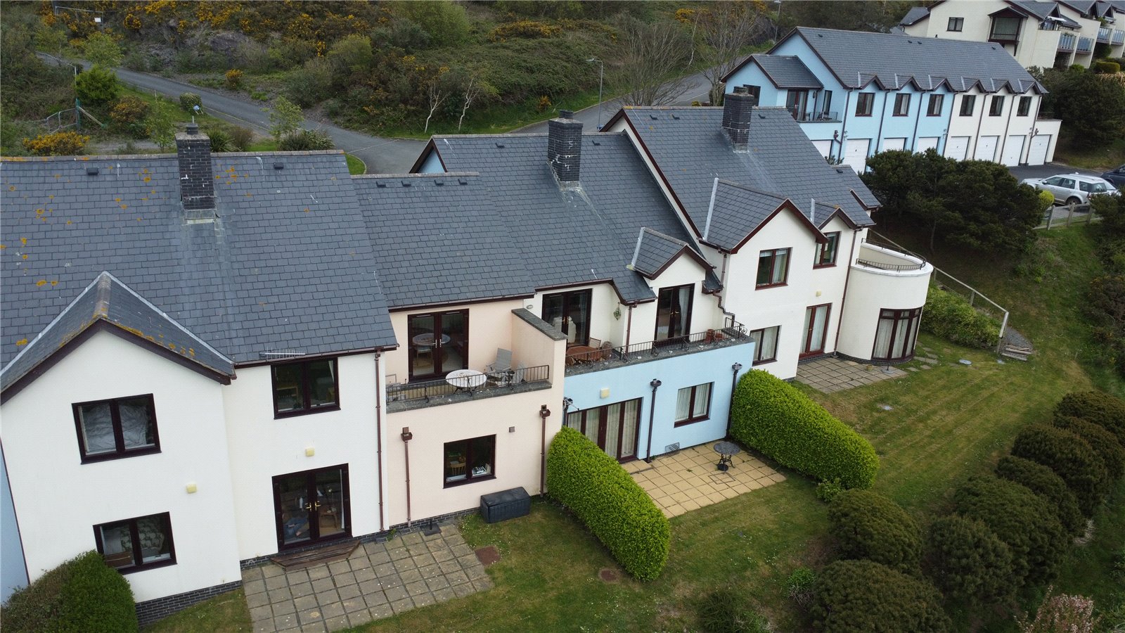 A well-appointed apartment situated in an elevated position with quite stunning estuary views. Hillside is a select development with luxury dwellings of varying types and description and is arguably one of the most sought after addresses within Aberdyfi. The whole area has an exclusive feeling with stunning well maintained grounds and well established communal gardens. The first floor property is approached by a walk way to an open storm porch and the accommodation briefly comprises, Entrance door to Reception Hall, Sitting Room with an open slated fireplace, working chimney and stunning estuary views, Dining room with French doors leading onto an large private terrace (not overlooked) with room for dining and sunbathing. The terrace enjoys breath taking estuary views some of the finest in Aberdyfi. A well-equipped modern fitted Kitchen with a range of base and eye level units, integrated oven and gas hob and space for white goods. Bedroom 2 refurbished Shower Room , Bedroom 1 with wonderful views and a refurbished en suite Bathroom. Detached from the property and a short distance a large double length garage.