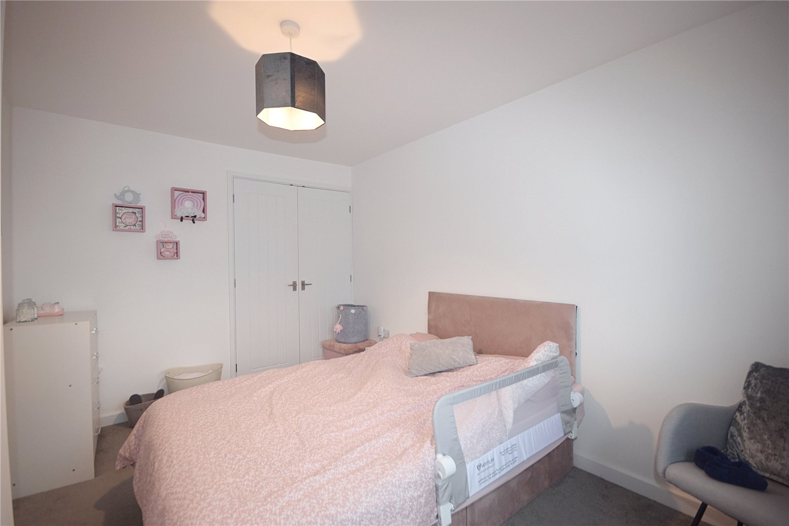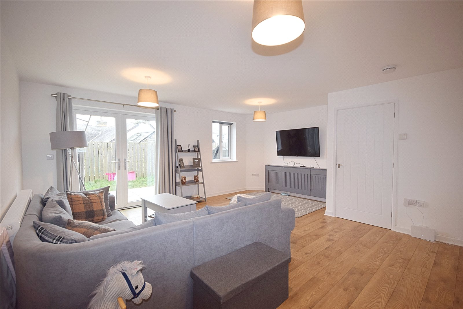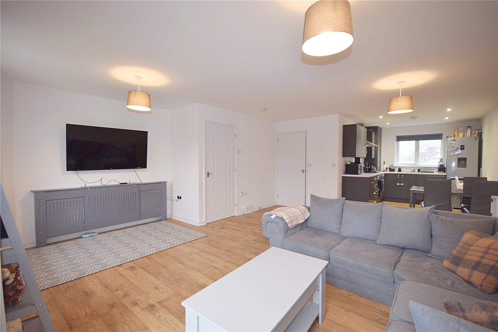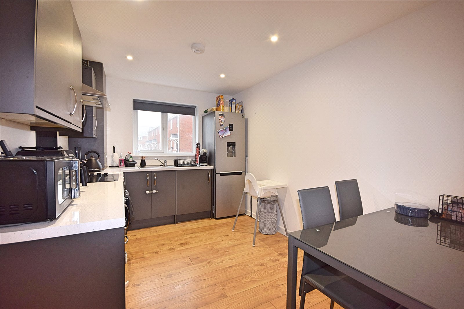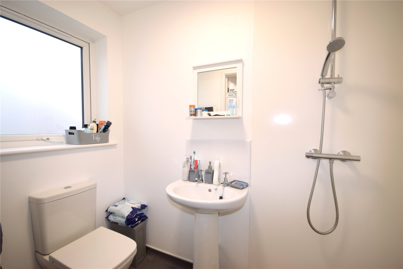 The property comprises of entrance hallway, with cloak cupboard and staircase to the first floor. Ground floor shower room, benefiting from a walk-in, wet room style shower, WC, basin and heated towel rail. The remainder of the ground floor is open plan, creating an excellent entertaining space, with dual aspect windows and French doors opening to the rear garden. Located towards front of the home, the kitchen benefits from a range of modern base and wall units, with laminate worktops. Integrated electric oven and ceramic hob with overhead extractor. Recess for a freestanding fridge freezer and washing machine. The living dining area provides ample space for a dining table and sofa, with wood effect flooring and under stairs storage cupboard.