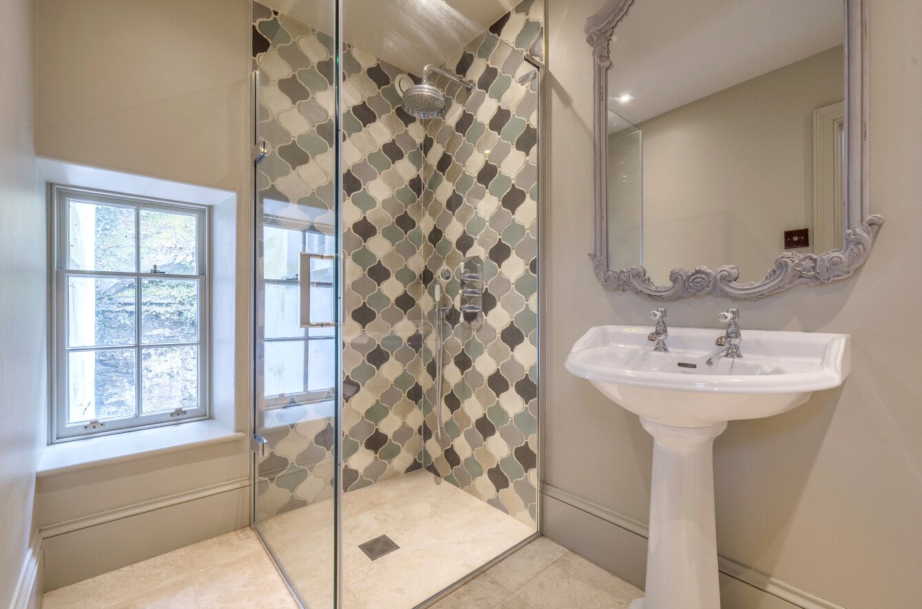 The first floor is arranged around a series of half-landings, leading to generously proportioned bedrooms, many with dual-aspect windows and original fireplaces in marble or cast iron. Bathrooms are elegantly appointed with roll-top baths, walk-in showers, and classic period detailing. In total the first floor comprises of seven tastefully decorated bedrooms, three contemporary bathrooms and an additional shower room.