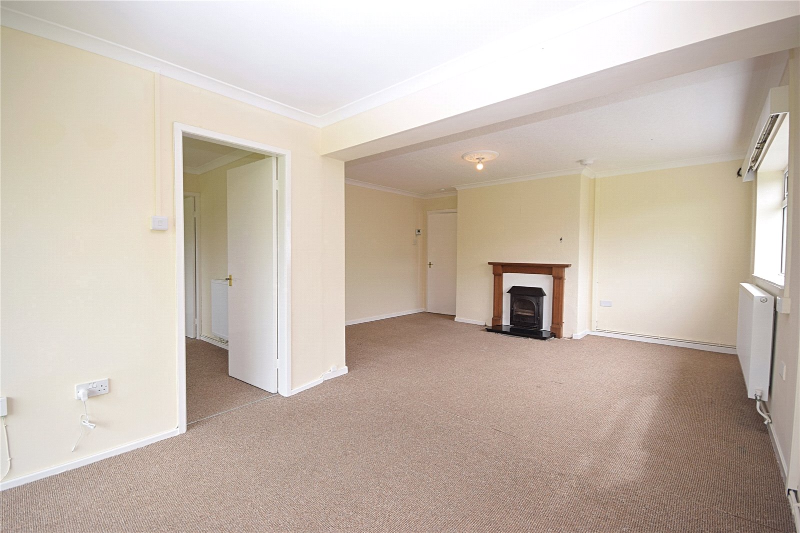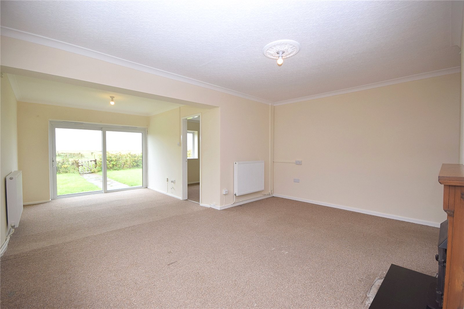 The property is entered through the kitchen, which is fitted with a range of base and wall units, laminate worktops, an inset stainless steel sink with drainer, and vinyl flooring. There are two front-facing windows, a small storage cupboard, and recesses for a freestanding oven, washing machine, dishwasher, and fridge freezer. The kitchen leads into an inner hallway, which in turn opens to the living and dining space. This generous L-shaped room enjoys dual-aspect windows, including a patio door opening to the rear garden with its far-reaching views. A stove set into the fireplace provides a central focal point, while the size of the room makes it ideal for entertaining. From here, access is gained to a versatile fourth bedroom or study, overlooking the garden, and through to a well-proportioned third bedroom to the rear.